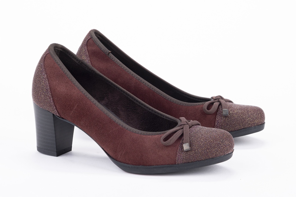 Zapatos tipo bailarina de tacón de piel serraje para mujer en color burdeos. Un calzado que va más allá de la bailarina e incorpora tacón, además de detalles con brillo en la puntera y en el talón para proporcionar estilo a cualquier look. Ideal para esta temporada. Apuesta por la comodidad con estilo chic. Fabricación 100% en España con materiales de primera calidad.