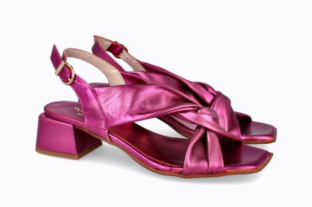 Este calzado de piel con tacón tipo sandalia para mujer en color fucsia. Tira cruzada delantera para estabilizar tu pie y cierre en la parte de atrás para mayor sujeción.