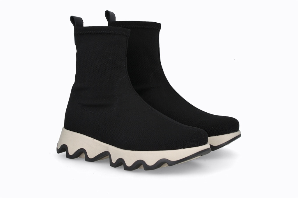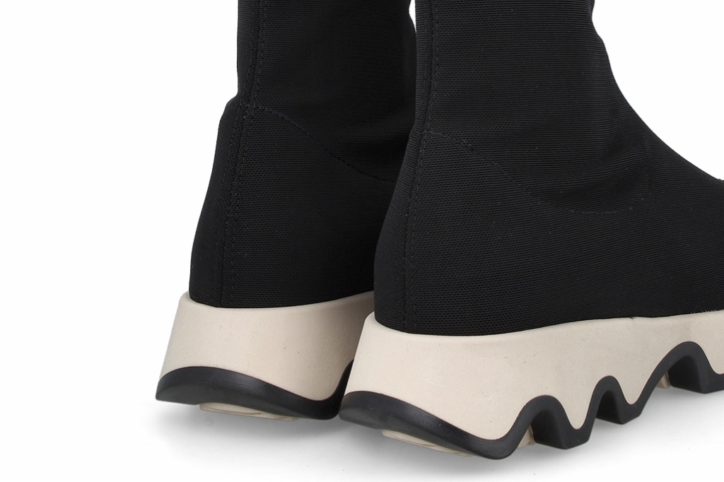 Sneakers negras de licra que combinan un diseño moderno con comodidad excepcional. Su suela ondulada añade estilo y estabilidad, mientras que el ajuste alto brinda soporte y una apariencia elegante. Perfectas para quienes buscan funcionalidad y moda en un solo calzado.