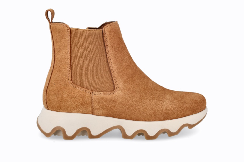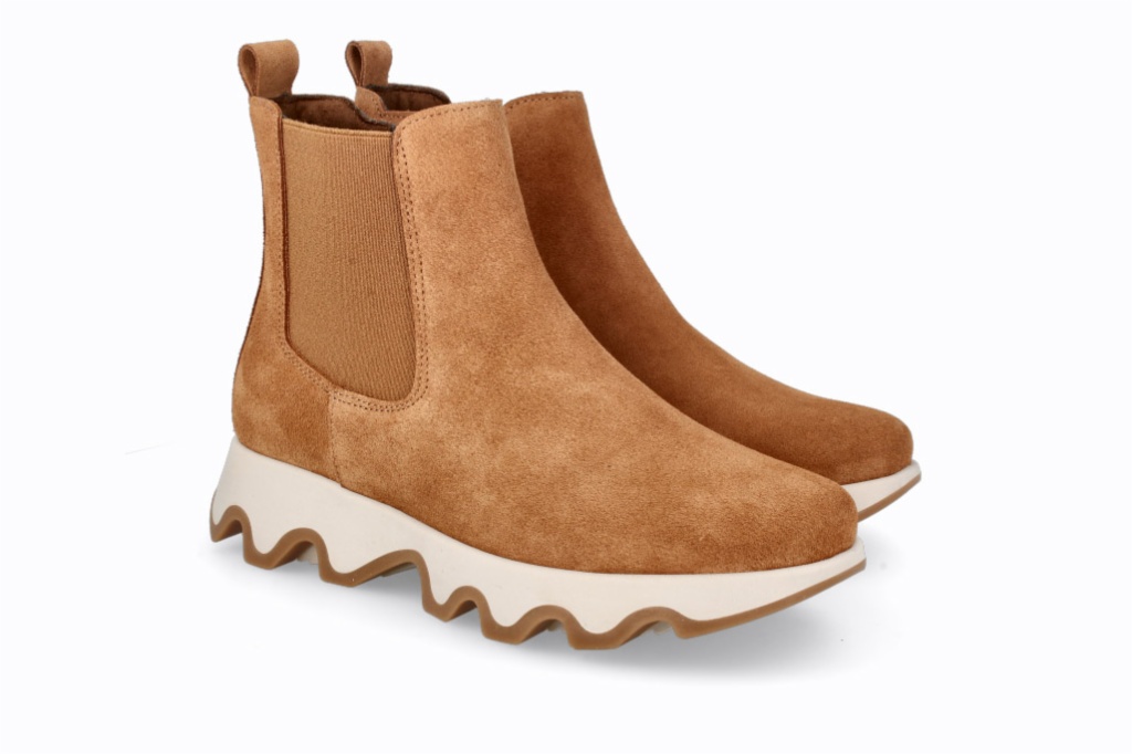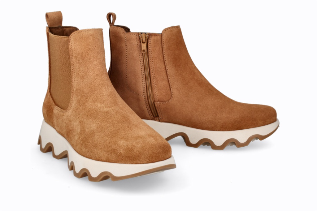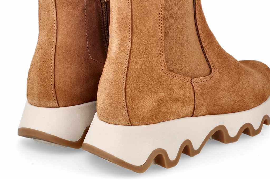 Botines de serraje ocre que combinan un diseño moderno con comodidad excepcional. Su suela ondulada añade estilo y estabilidad, mientras que el ajuste alto brinda soporte y una apariencia elegante. Perfectos para quienes buscan funcionalidad y moda en un solo calzado.