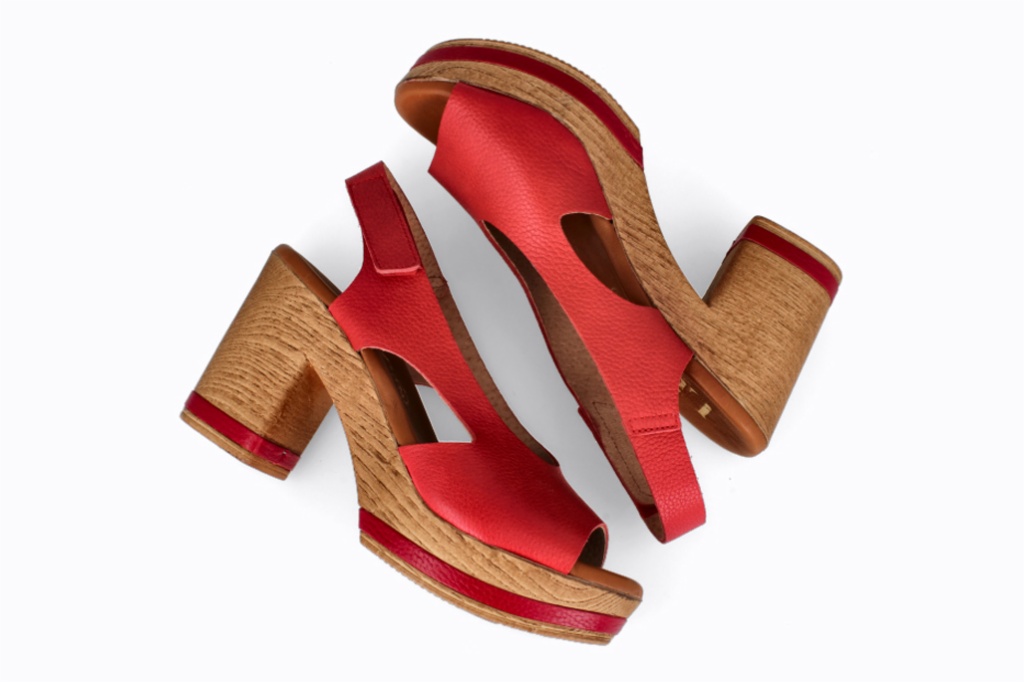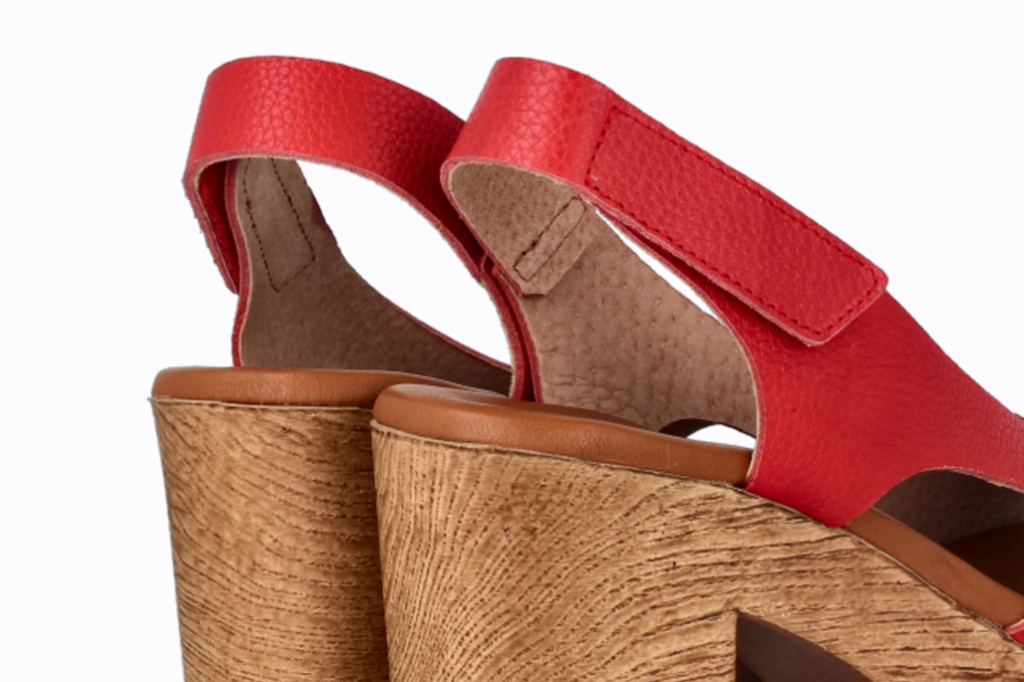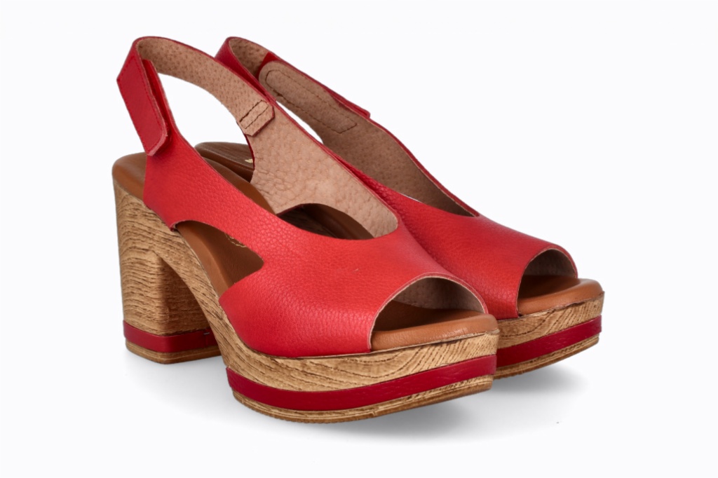 Sandalia de tacón ancho con plataforma efecto madera y detalles a contraste en la base. Diseño envolvente con aberturas laterales y cierre trasero con velcro para un ajuste fácil. Una opción elegante y cómoda que estiliza sin renunciar al confort.