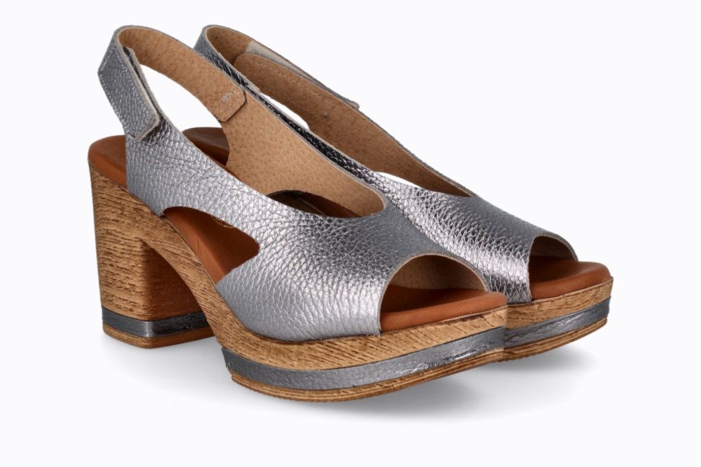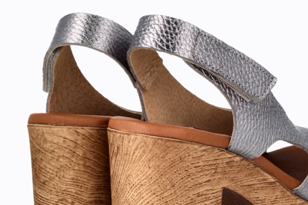 Plataforma y tacón efecto madera con detalles a juego que aportan armonía y personalidad.