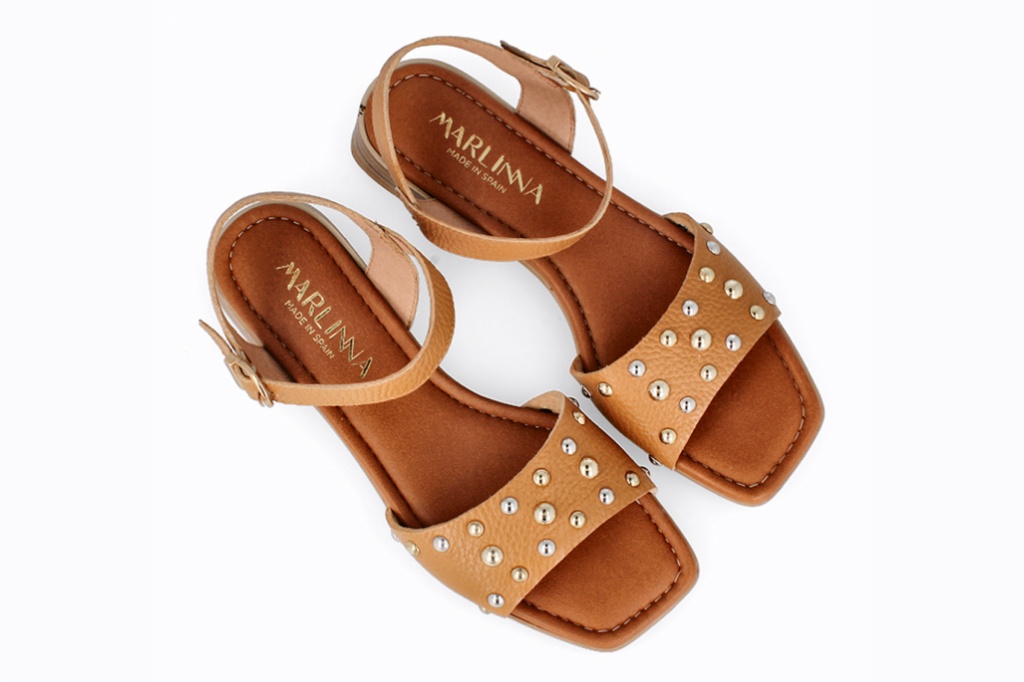 Sandalias de piel color camel con remaches metálicos decorativos. Diseño de tiras cruzadas y hebilla ajustable para un ajuste cómodo. Suela que proporciona estabilidad y agarre en superficies variadas.