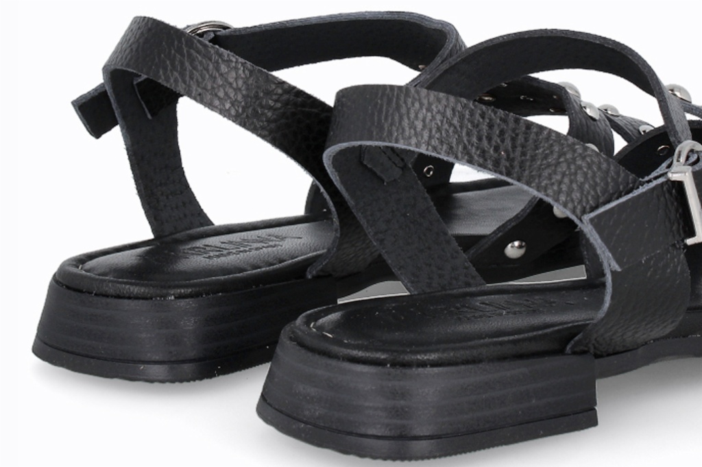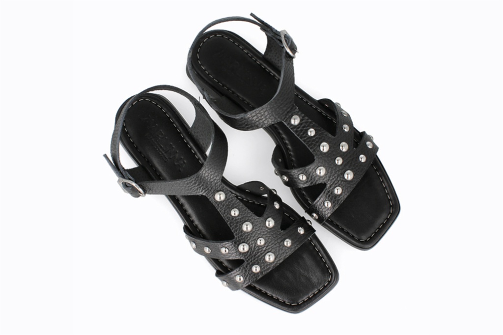 Sandalias de peil en color negro con remaches metálicos decorativos. Diseño de tiras cruzadas y hebillas ajustables para un ajuste personalizado. Ideales para el verano.