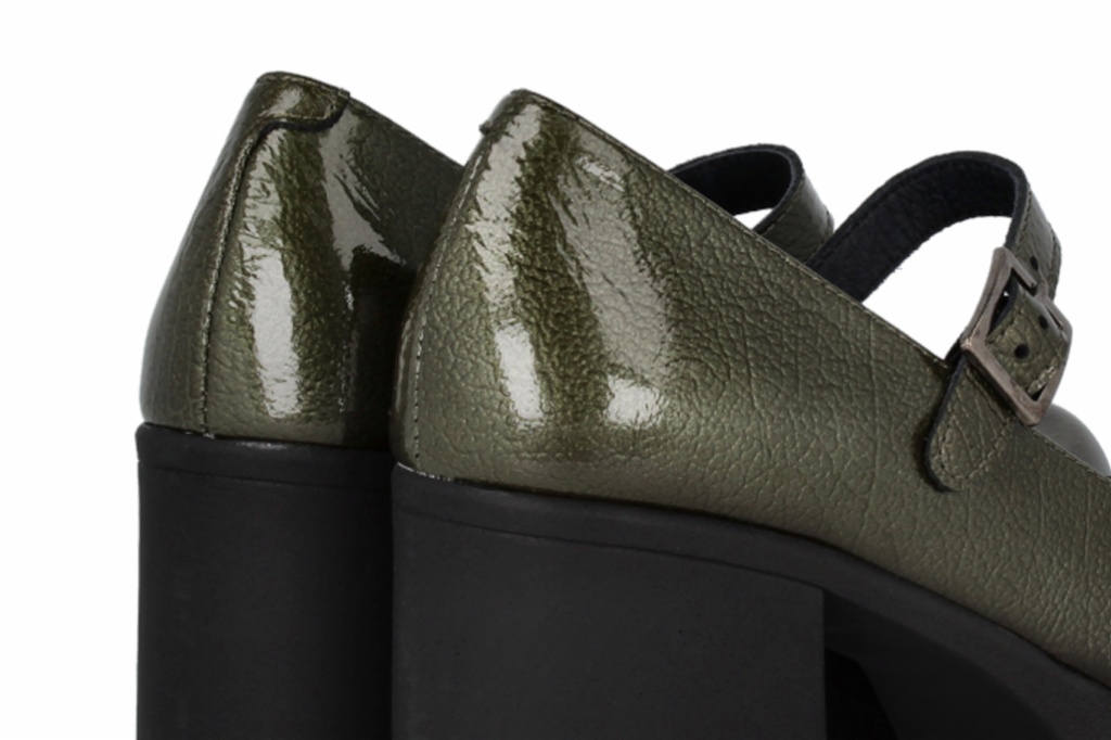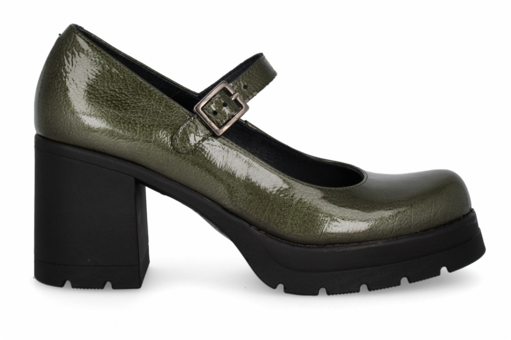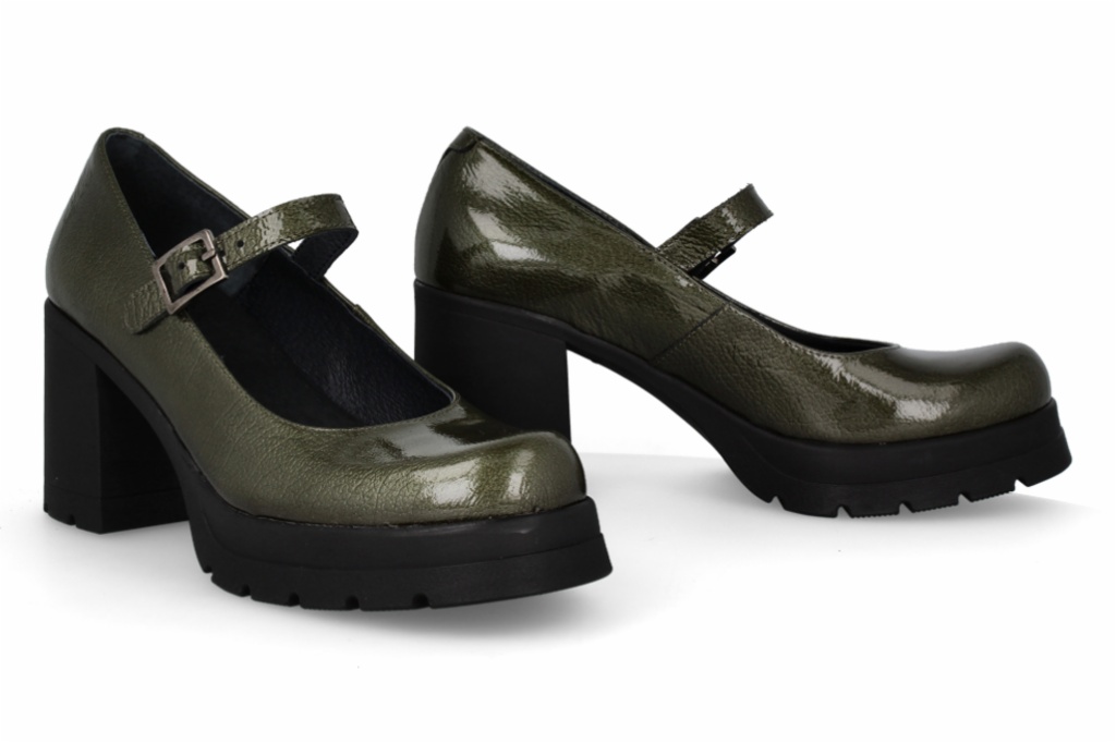Zapatos estilo Mary Jane con una estética audaz, en un tono verde oliva. Diseño de plataforma chunky con suela dentada y un tacón de bloque robusto para máxima estabilidad. Pulsera con hebilla ajustable sobre el empeine que proporciona un ajuste seguro y un toque retro moderno.