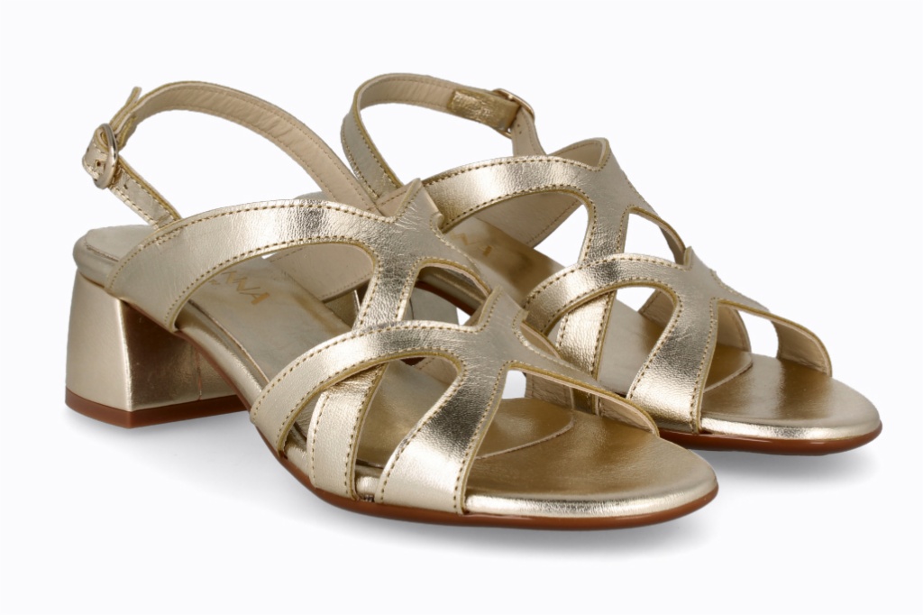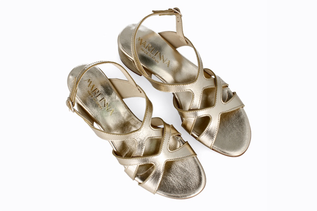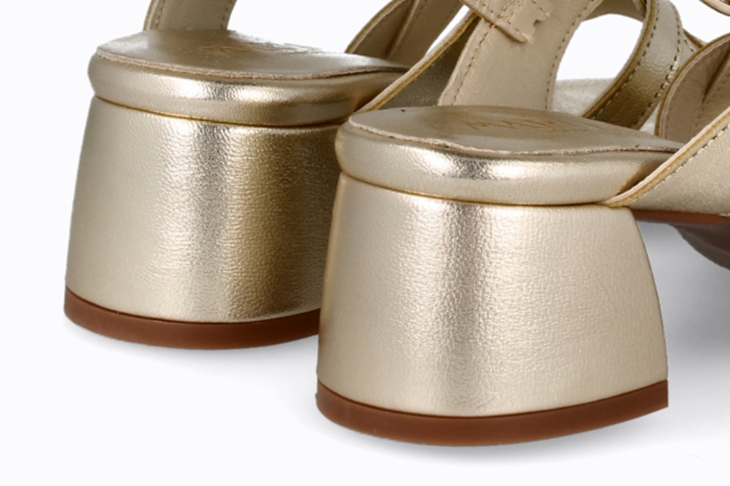 Estas sandalias de tacón bajo presentan un diseño con correas entrecruzadas en color dorado metálico. Las correas ajustables en el tobillo y el empeine permiten un ajuste personalizado y cómodo. La suela de gel proporciona estabilidad y agarre. Este modelo de sandalias doradas es ideal para lucir un look elegante y sofisticado en diferentes ocasiones.