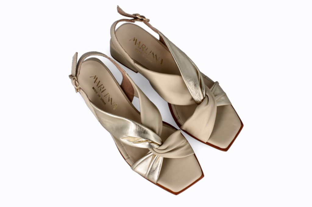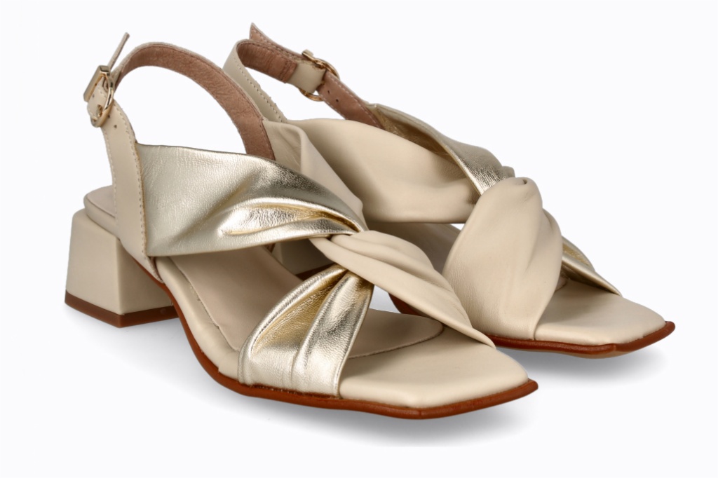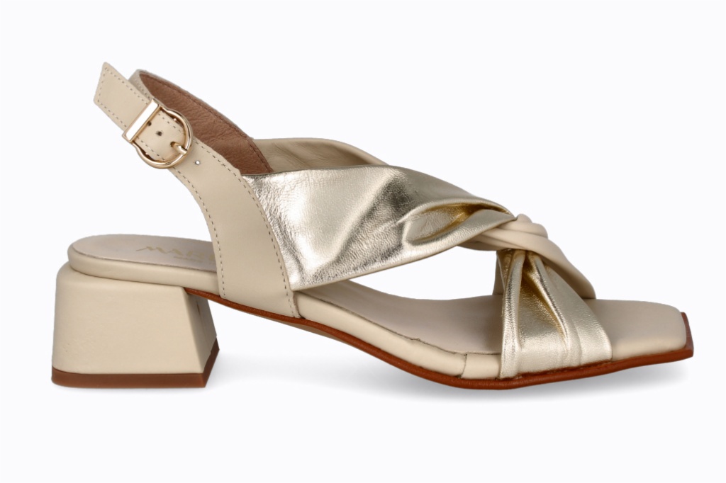 Este calzado de piel con tacón tipo sandalia para mujer en color platino combinada con beig. Tira cruzada delantera para estabilizar tu pie y cierre en la parte de atrás para mayor sujeción.