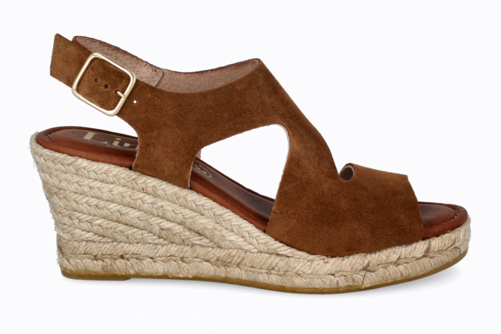 Cuña de esparto con tiras cruzadas en piel y hebilla ajustable en el tobillo.