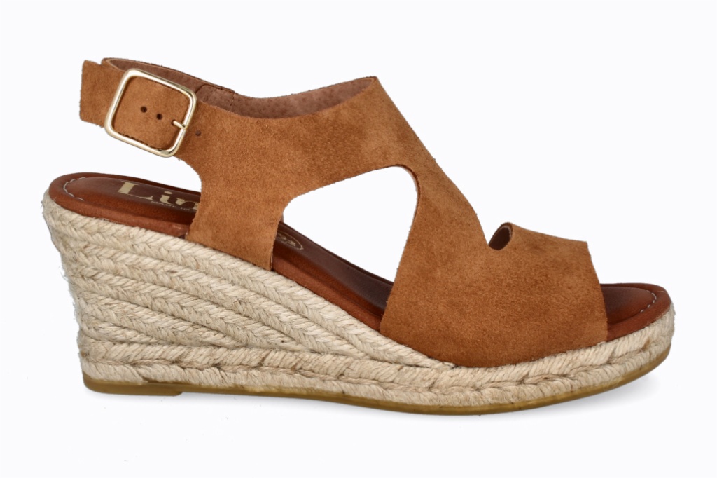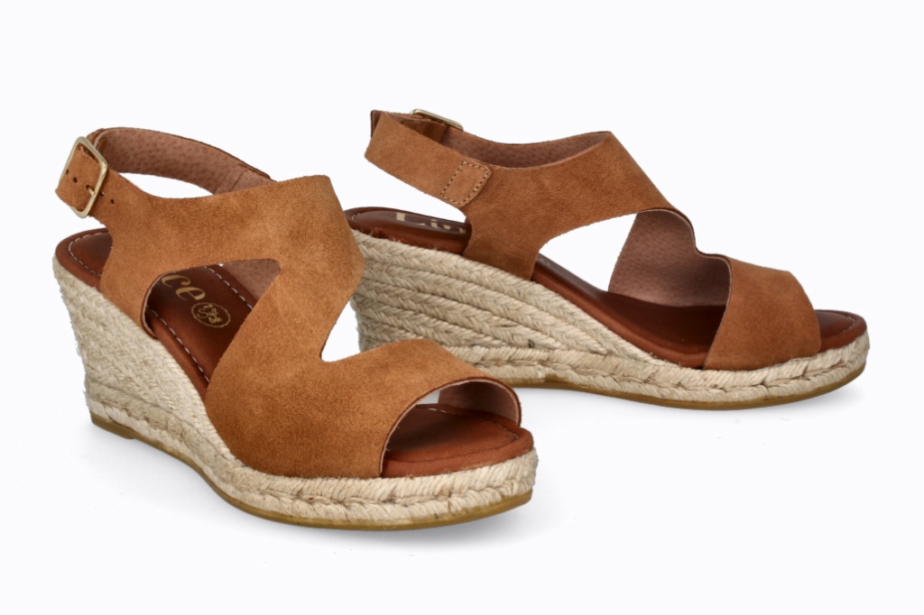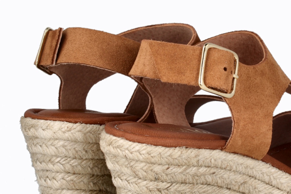 Cuña de esparto con tiras cruzadas en piel y hebilla ajustable en el tobillo.