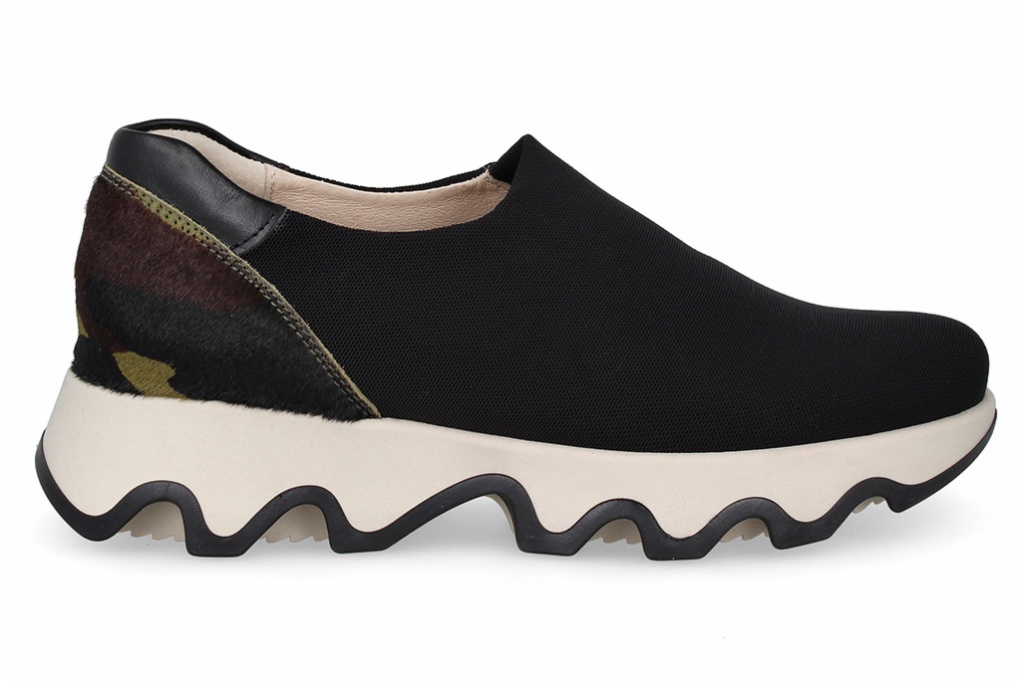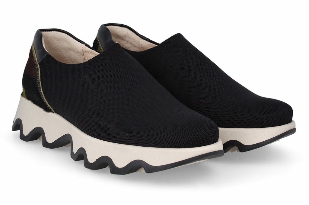 Sneakers con diseño moderno y suela ondulada que aporta un toque único y vanguardista. Combinan un color negro con un detalle de estampado de camuflaje en el talón, ideales para destacar. Perfectas para quienes buscan estilo y comodidad en su día a día.