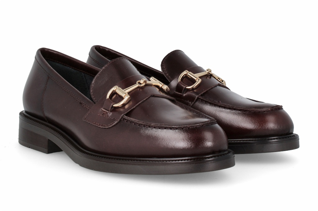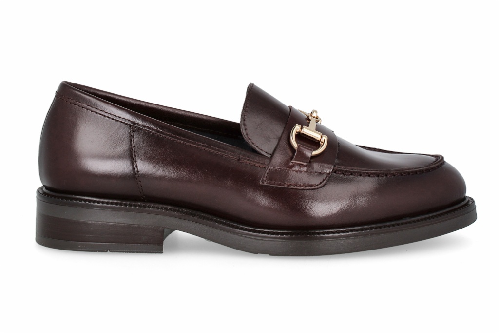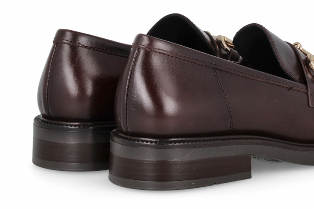 Estos mocasines de piel en color marrón destacan por su elegancia atemporal y su acabado suave al tacto. Incorporan un detalle metálico en el empeine que aporta un toque sofisticado. Perfectos para elevar cualquier look diario con estilo y comodidad.