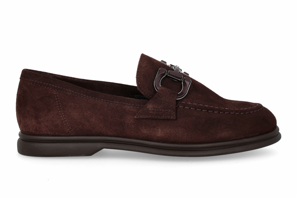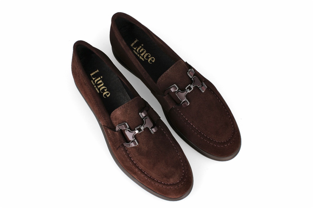 Estos mocasines de serraje en color marrón destacan por su elegancia atemporal y su acabado suave al tacto. Incorporan un detalle metálico en el empeine que aporta un toque sofisticado. Perfectos para elevar cualquier look diario con estilo y comodidad.