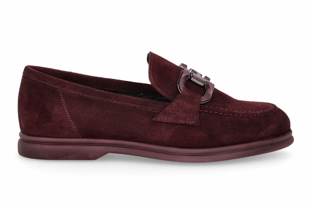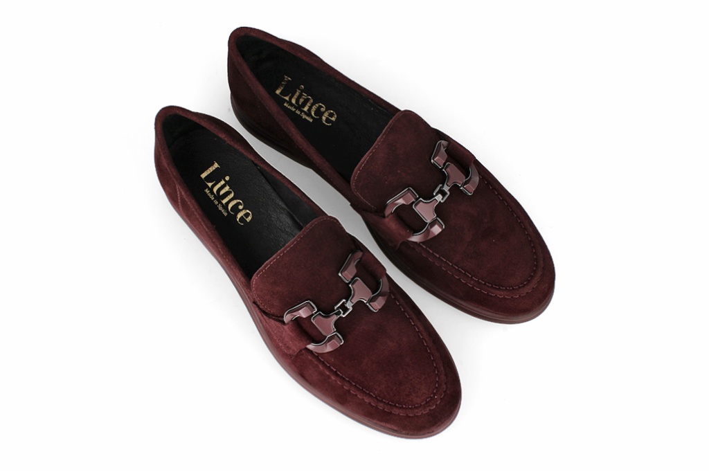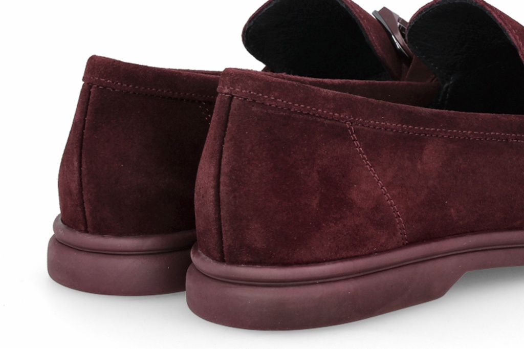 Eleva tu estilo formal o casual con estos mocasines en exquisito ante color burdeos. Destacan por el clásico adorno metálico de estribo en el empeine, ofreciendo un toque de distinción atemporal. Su suela del mismo tono garantiza la máxima comodidad y flexibilidad, haciendo de este zapato un imprescindible de fondo de armario.
