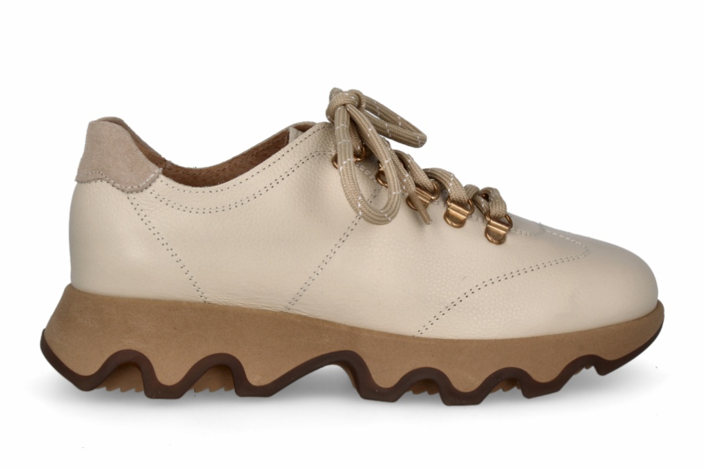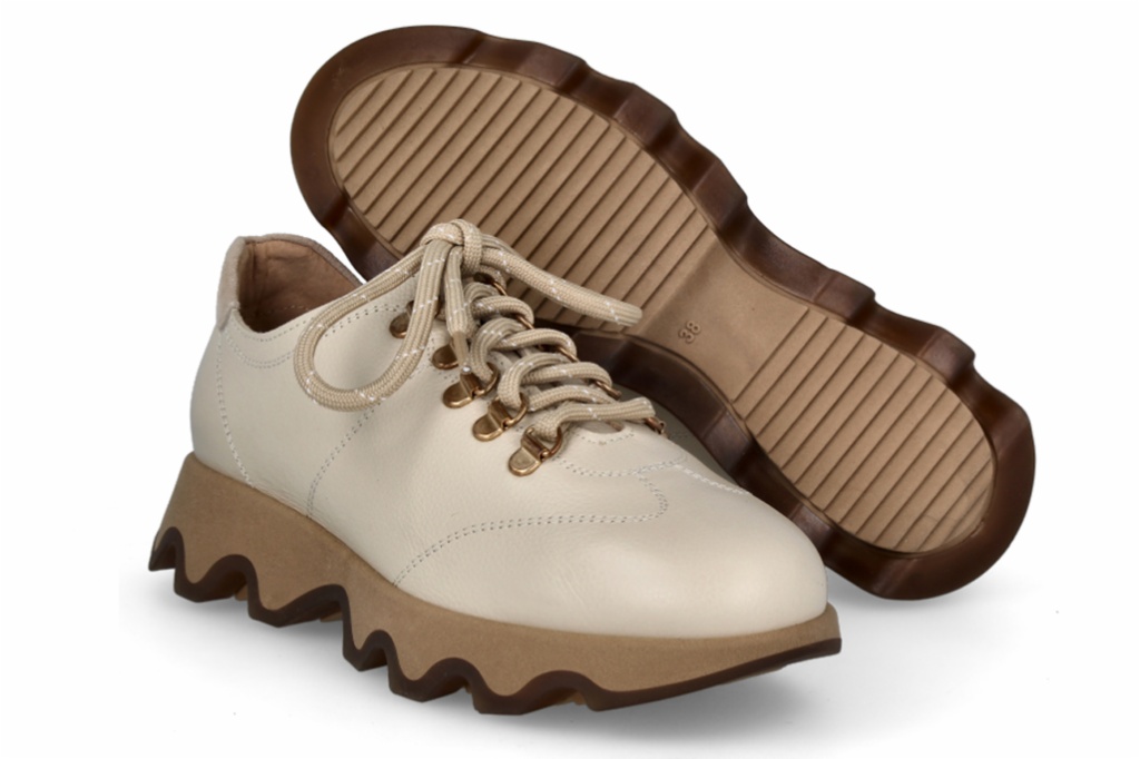 Su característica principal es la suela de plataforma ondulada en tono arena, que ofrece una silueta atrevida y vanguardista sin sacrificar la comodidad.