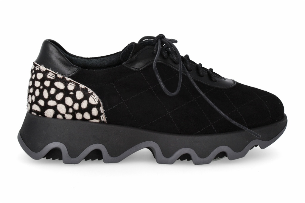Sneakers de plataforma en color negro, ofreciendo un estilo moderno y una comodidad excepcional. Diseño sofisticado con un cuerpo de ante acolchado y un llamativo detalle de pelo con animal print en el talón. Suela chunky de patrón ondulado que proporciona una pisada suave, altura y un gran agarre antideslizante.