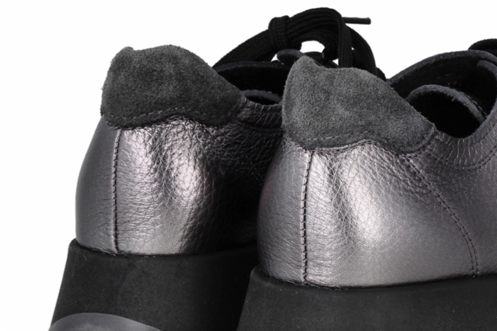 sneakers urbanas con un acabado metalizado en tono plateado oscuro, perfectas para destacar. Diseño de inspiración trekking con ojales robustos y cordones negros, combinando moda y funcionalidad. Suela chunky de plataforma con un llamativo patrón ondulado que aporta máxima comodidad y altura.