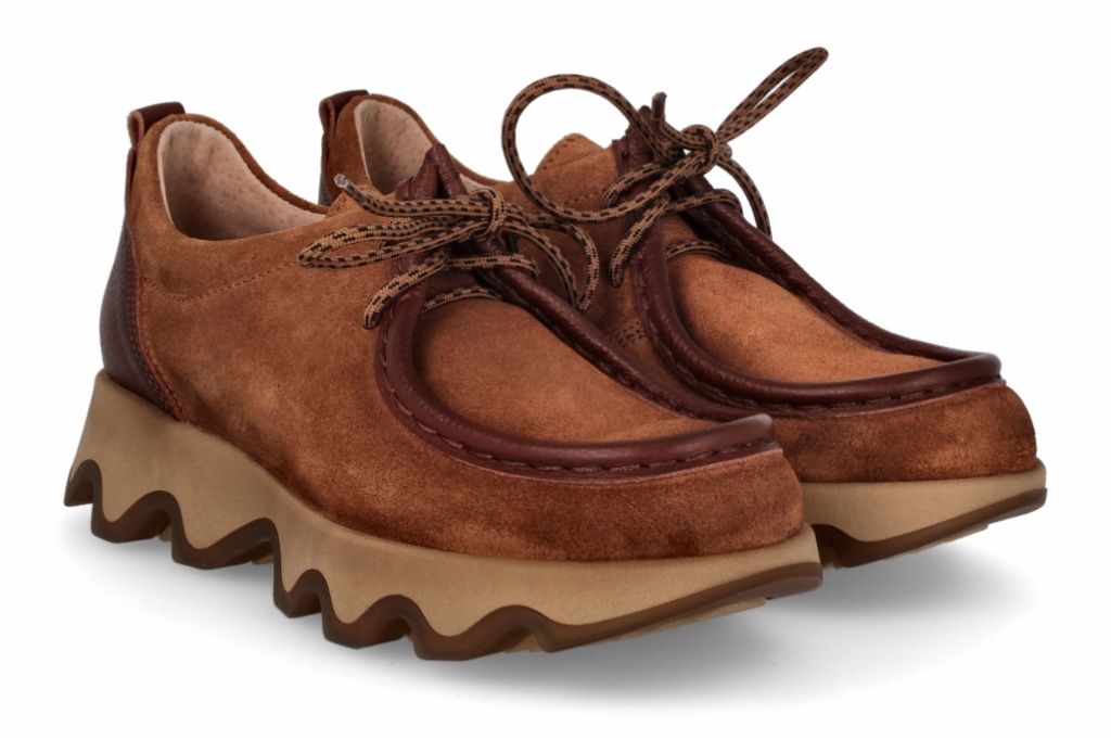 Zapatos estilo Wallabee con un toque moderno, combinando suave ante y detalles en piel lisa. Diseño cómodo y robusto con cordones de estilo trekking y un distintivo ribete en la puntera. Suela de plataforma chunky de cuña con patrón ondulado, proporcionando altura y una pisada amortiguada y estable.