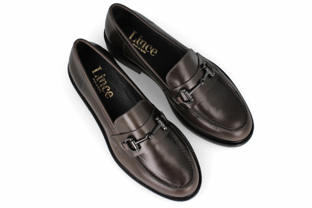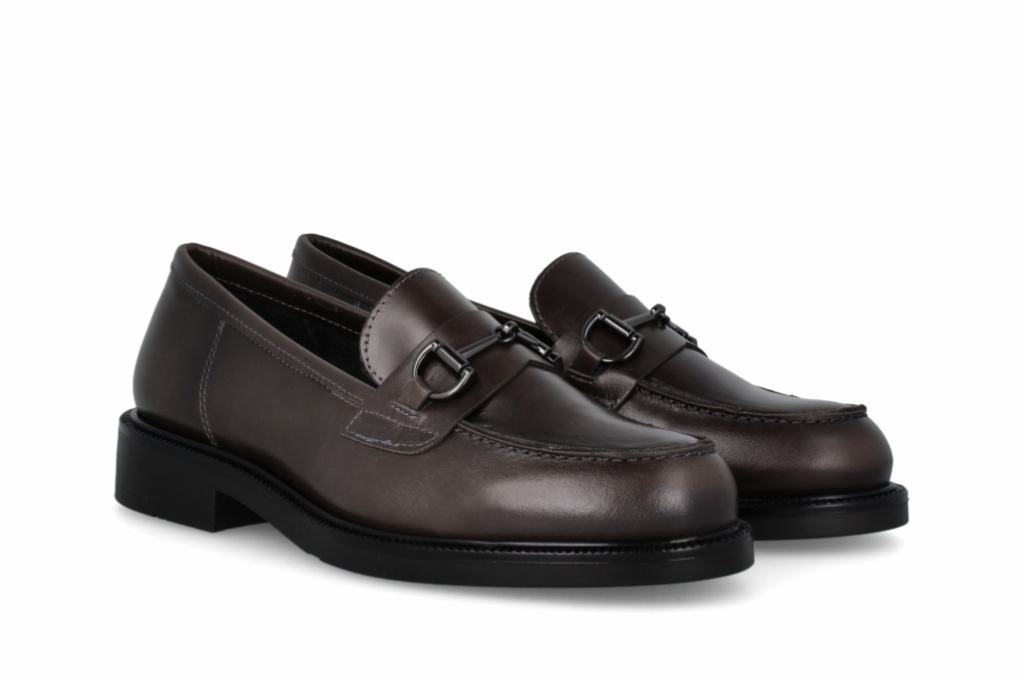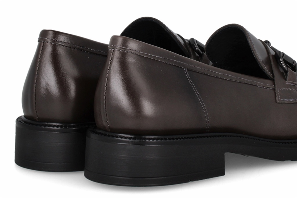 Mocasines de estilo clásico en piel de color gris topo, con un elegante adorno de estribo metálico en tono plomo. Cuentan con una suela de plataforma robusta y moderna, que equilibra a la perfección lo formal y lo casual. Estos loafers son el toque de distinción que necesita tu fondo de armario, combinando tradición y vanguardia.