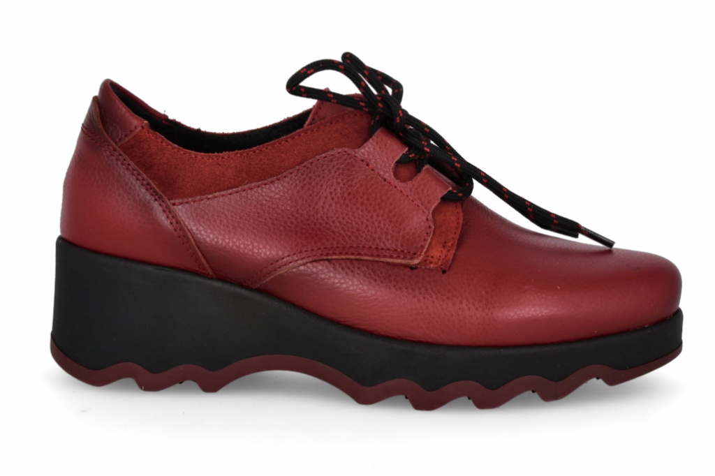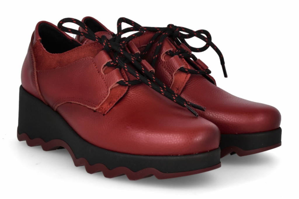 Estos llamativos bluchers combinan la piel de un vibrante color rojo con detalles en ante al tono, creando un diseño enérgico y con carácter. El modelo se asienta sobre una plataforma audaz y gruesa en negro con una suela ondulada que asegura comodidad y un estilo moderno. Con cordones bicolores, son el calzado perfecto para inyectar personalidad y altura a tu look casual.