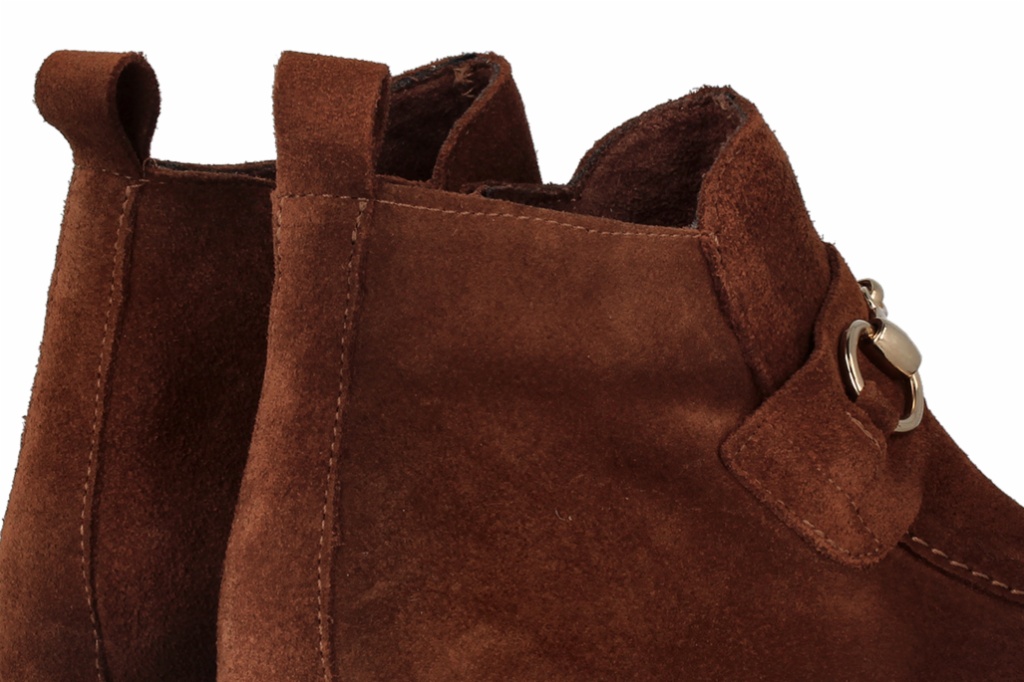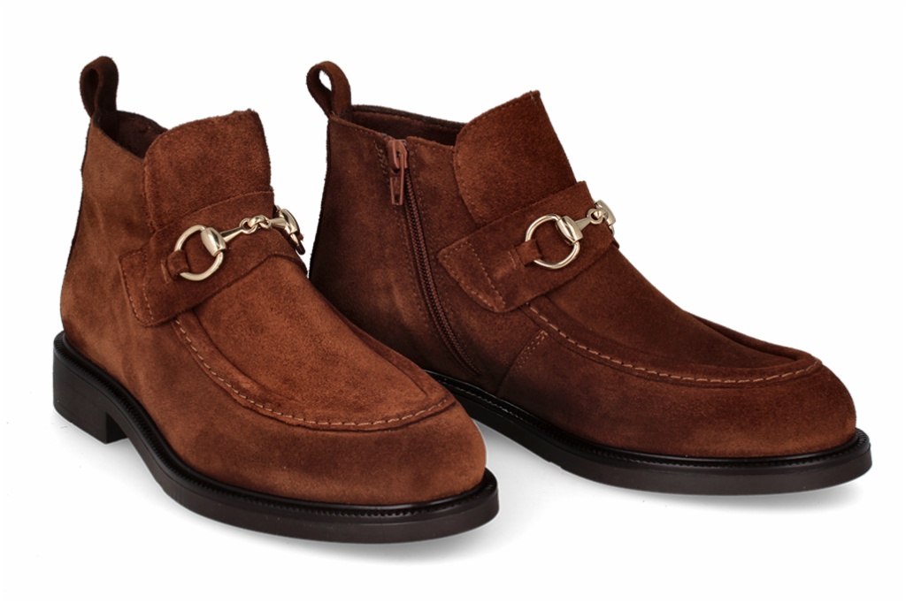 Botines de piel en tono marrón oscuro, con un elegante detalle de hebilla metálica dorada, combinando el estilo de mocasín con el de bota. Su diseño tobillero y suela robusta ofrecen un look sofisticado y a la moda, perfectos para un estilo casual o más formal con un toque distintivo.
