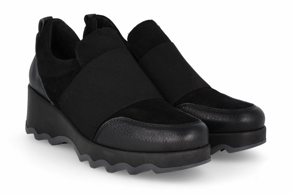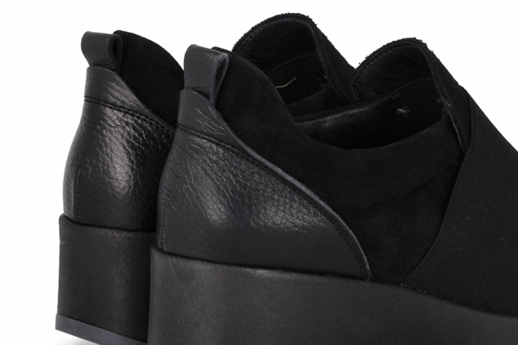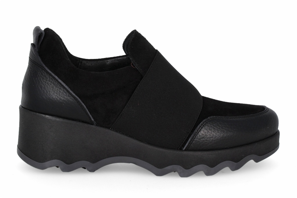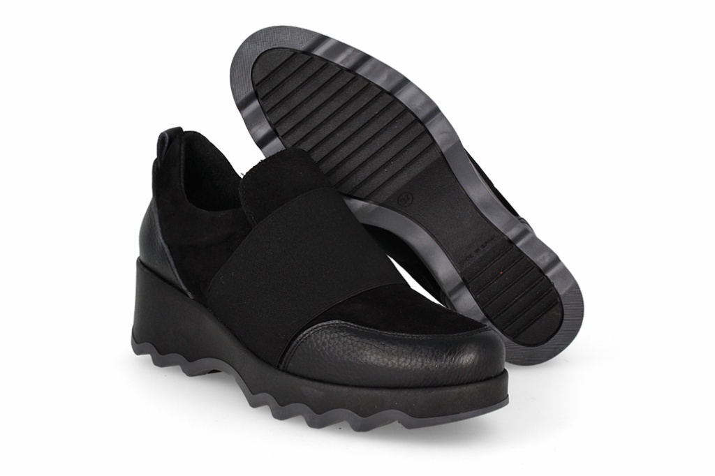 Estos botines de piel en color negro destacan por su diseño funcional con una amplia banda elástica central que facilita el calce y asegura una sujeción perfecta. Su estructura aporta un aire contemporáneo y dinámico que se adapta a cualquier look diario. La innovadora suela de cuña con acabado ondulado no solo estiliza la silueta, sino que proporciona una amortiguación excepcional y un agarre firme en cada paso.