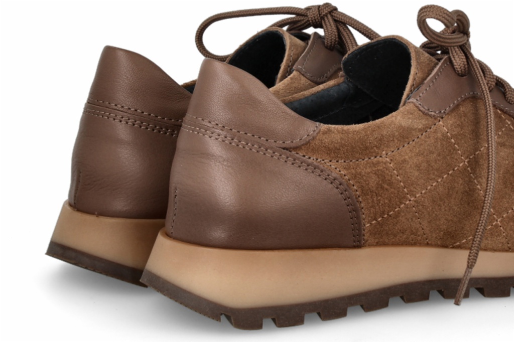 Estos sneakers en color avellana destacan por un sofisticado diseño acolchado con costuras en patrón de diamante, aportando una textura rica y elegante al calzado.