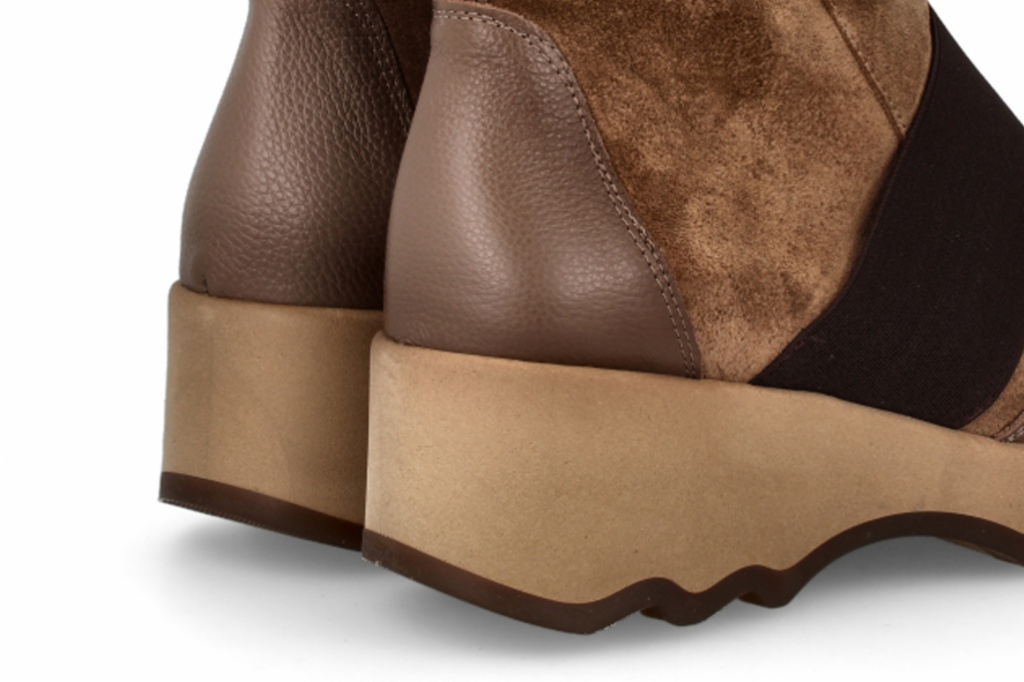 Botines en tonos tierra que fusionan estilo y confort, ideales para un look casual y elevado. Confeccionados en suave piel, con una banda elástica central para un ajuste fácil y firme al tobillo. Suela de cuña alta con plataforma dentada, que proporciona excelente altura y una pisada estable y cómoda.