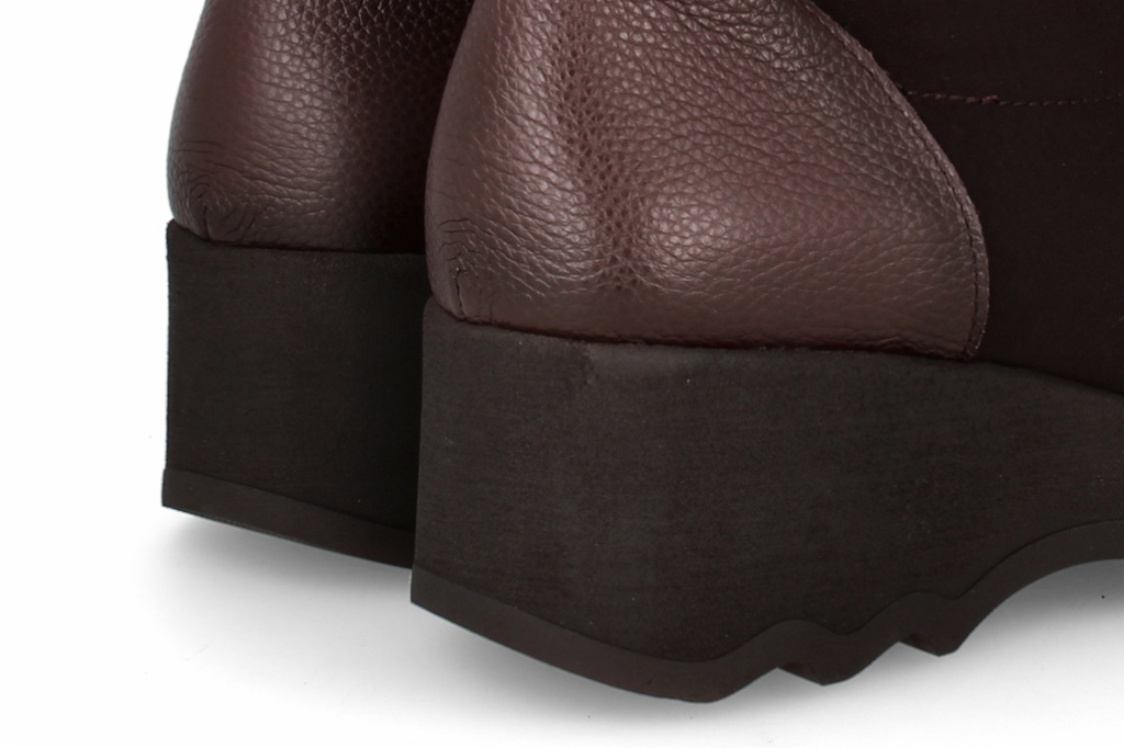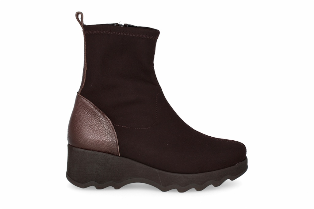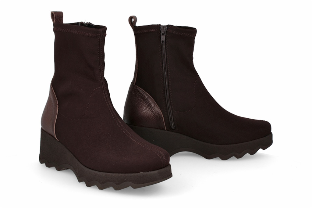 Estos botines de licra en color marrón oscuro combinan estilo y comodidad, ofreciendo un ajuste ceñido. Cuentan con una moderna cuña de suela track y un elegante detalle de piel en el talón. Son perfectos para elevar tus looks diarios, brindando altura y una pisada confortable en cualquier ocasión.