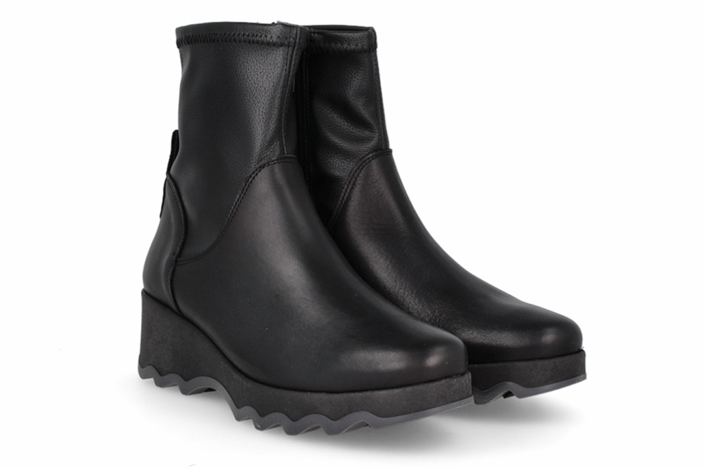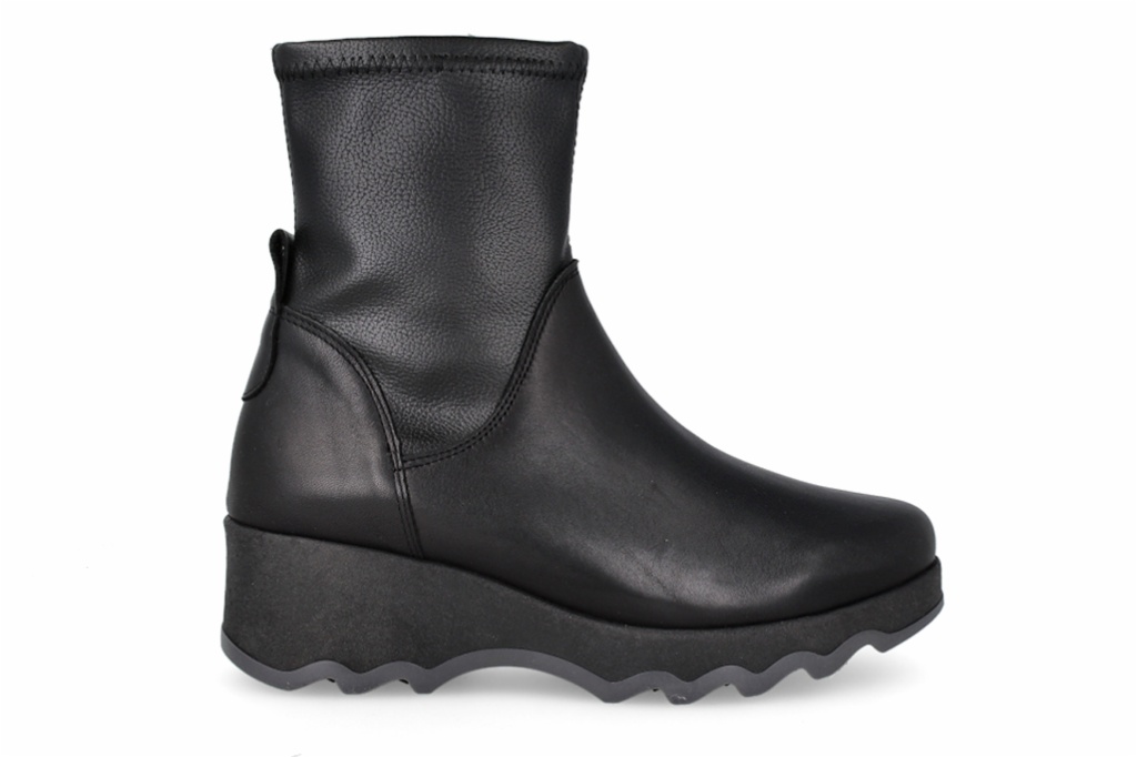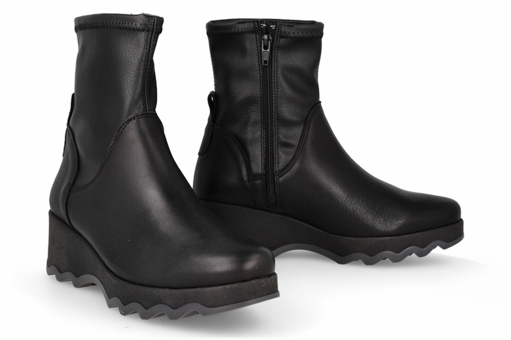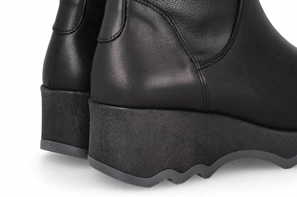 Botines de estilo moderno con un cómodo efecto calcetín en la caña, ideales para looks urbanos. Confeccionados en piel negra de alta calidad, combinando confort y un ajuste impecable al tobillo. Suela de plataforma tipo cuña con relieve ondulado que proporciona altura, estabilidad y un toque distintivo.
