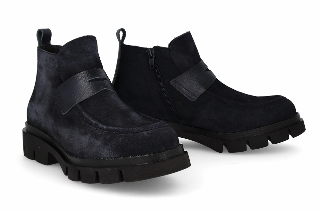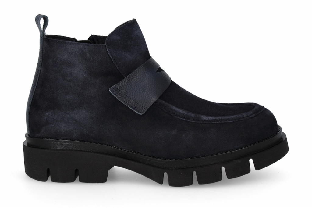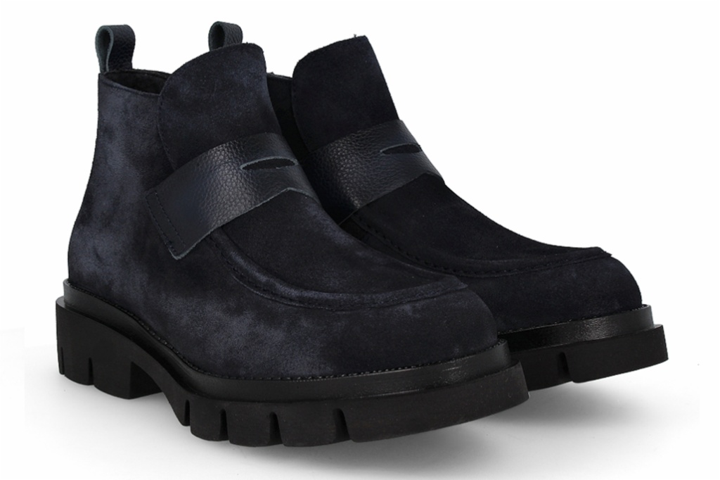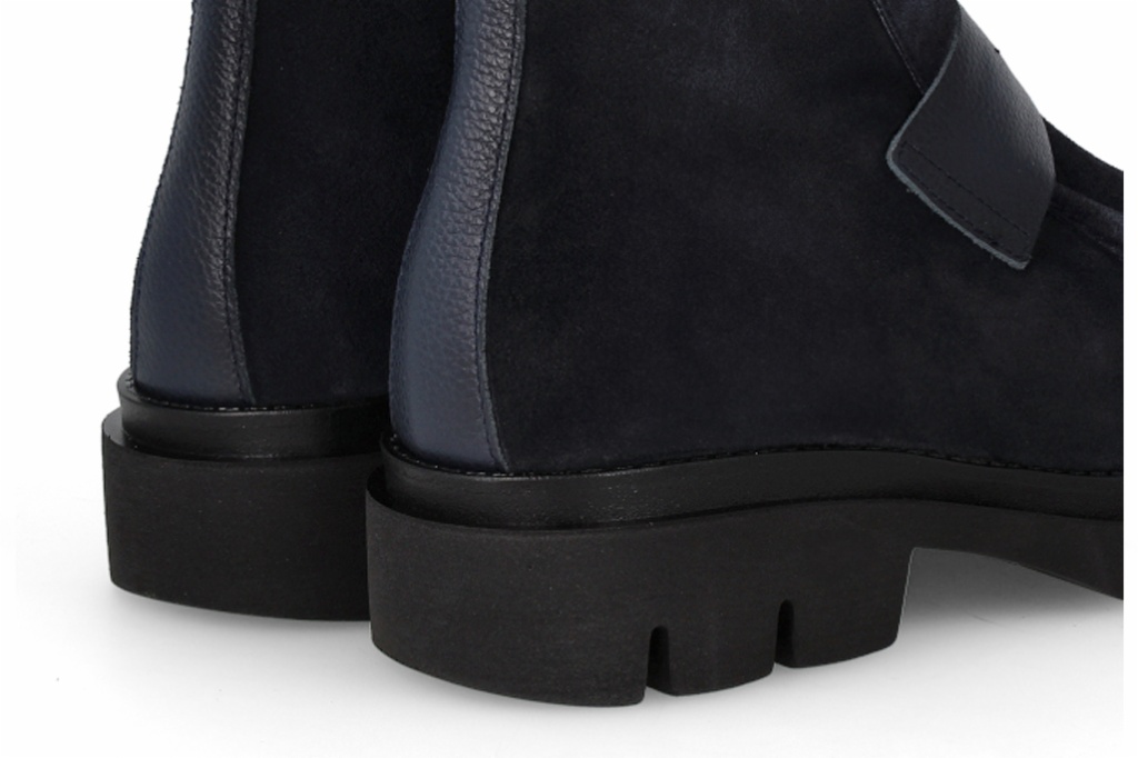 Estos botines de diseño único combinan la suavidad del serraje azul marino oscuro con el estilo de un mocasín, gracias a la tira de piel en el empeine tipo penny loafer. Se asientan sobre una suela ancha y robusta que ofrece un confort excepcional y una pisada segura y moderna. Son la mezcla perfecta de elegancia clásica y tendencia chunky para tus looks de invierno.