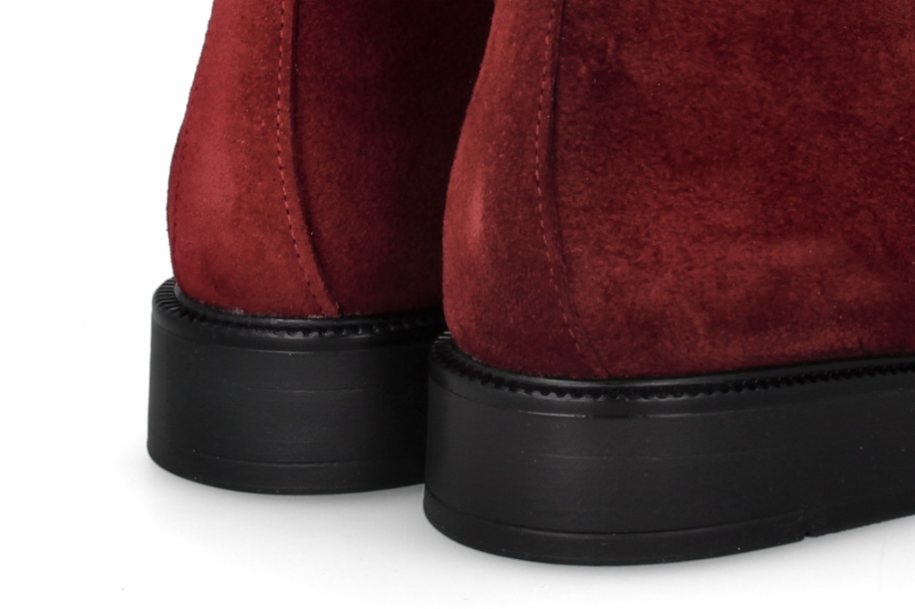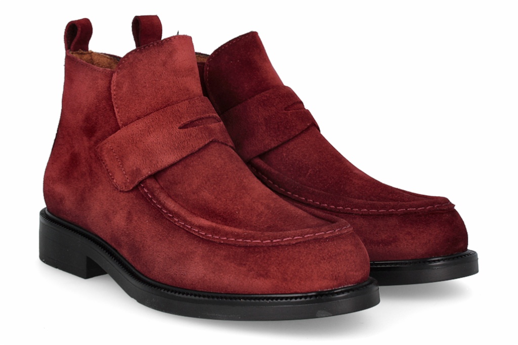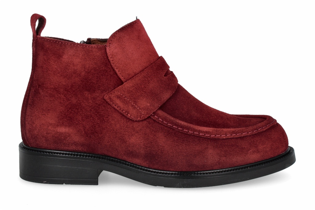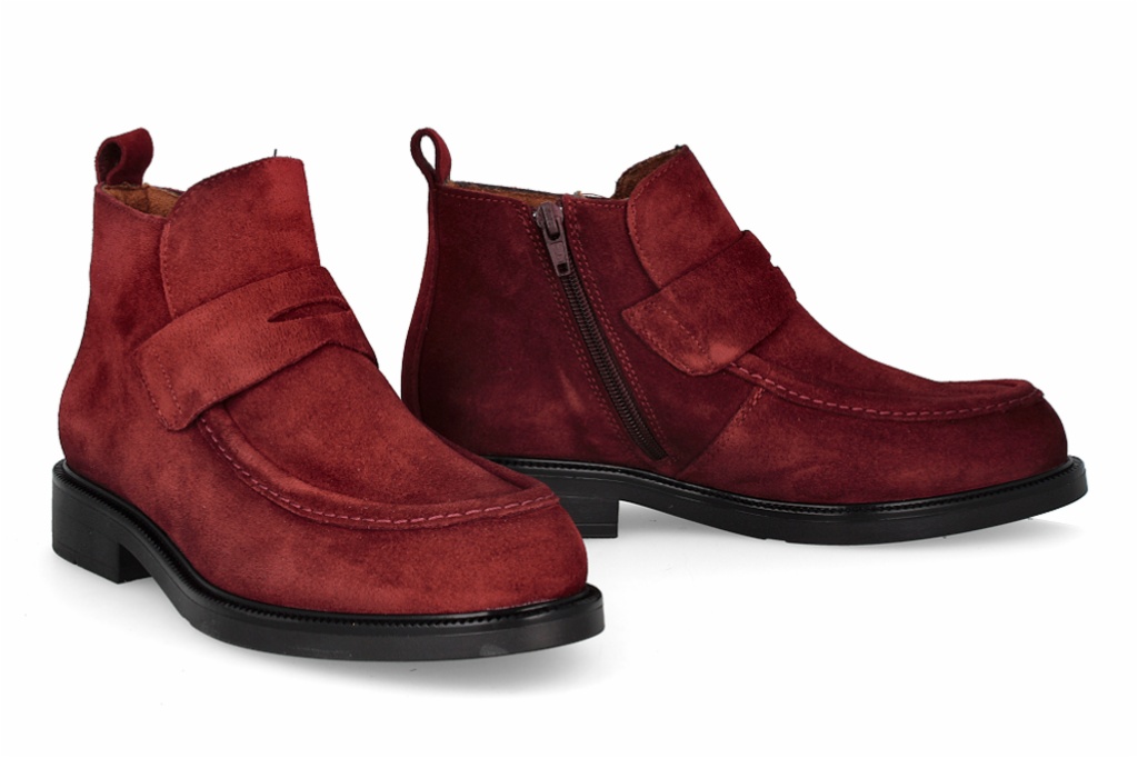 Botines de estilo loafer confeccionados en piel en un intenso tono granate. Diseño de caña baja con una pala cosida distintiva y un detalle de tira superpuesta en el empeine. Suela robusta en contraste que ofrece gran agarre y un tacón bajo para una pisada cómoda y estable.