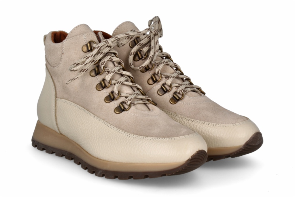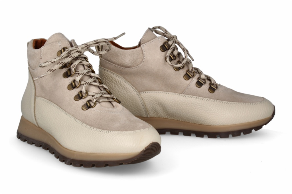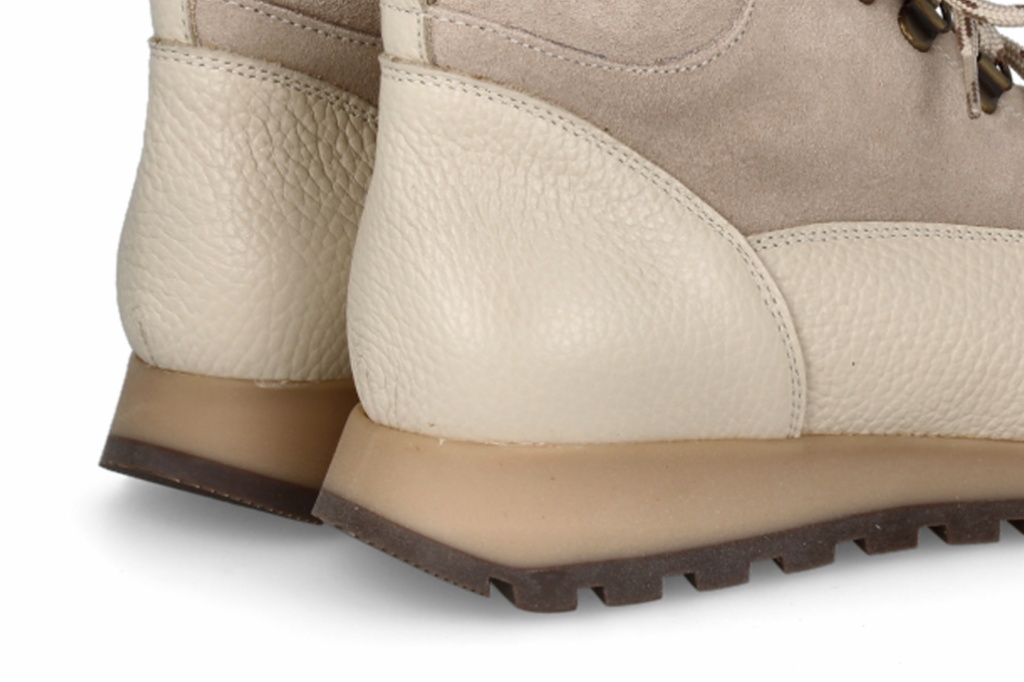 Estos botines son ideales para un estilo outdoor urbano y sofisticado. Destacan por sus ojales metálicos reforzados y cordones bicolores de alta resistencia que ofrecen un ajuste óptimo hasta el tobillo. La suela track de alto impacto proporciona una pisada estable y segura, fusionando perfectamente la estética de montaña con el confort diario.
