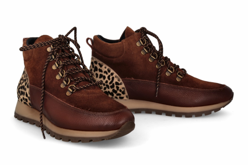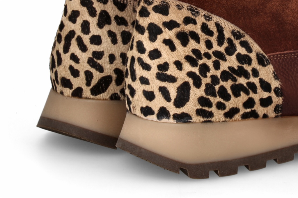 La silueta robusta se contrasta con un atrevido detalle de animal print de leopardo en el talón que añade carácter. La suela track bicolor garantiza comodidad y agarre en cualquier superficie.