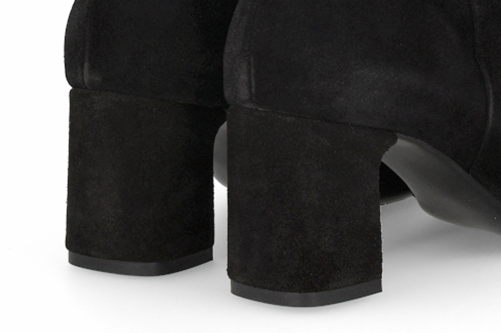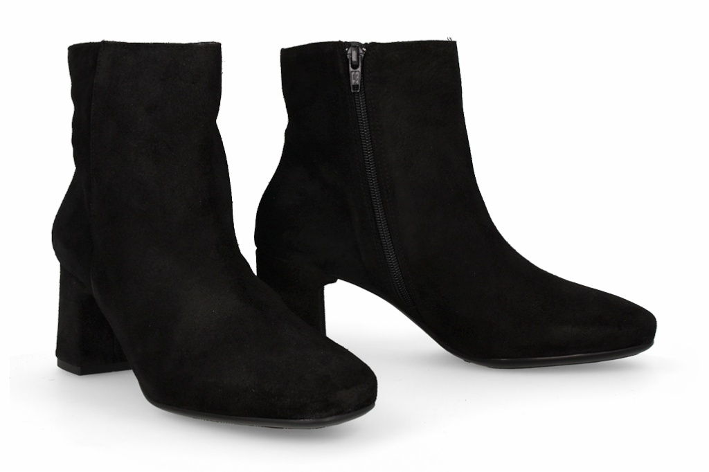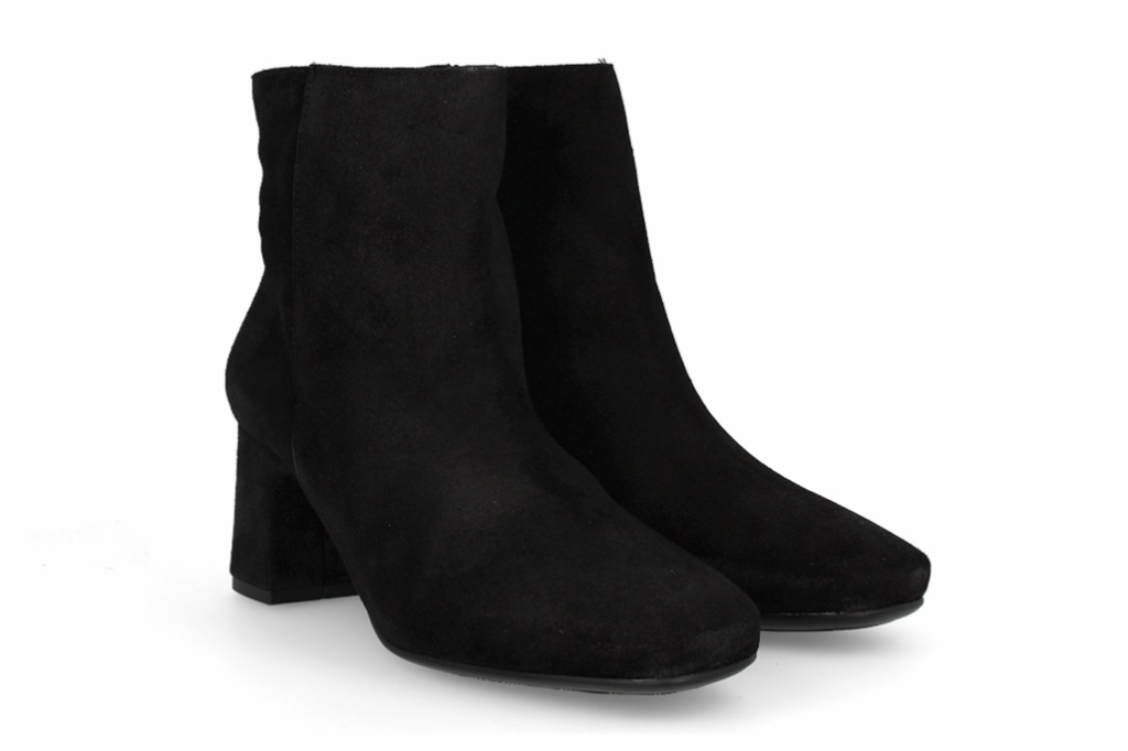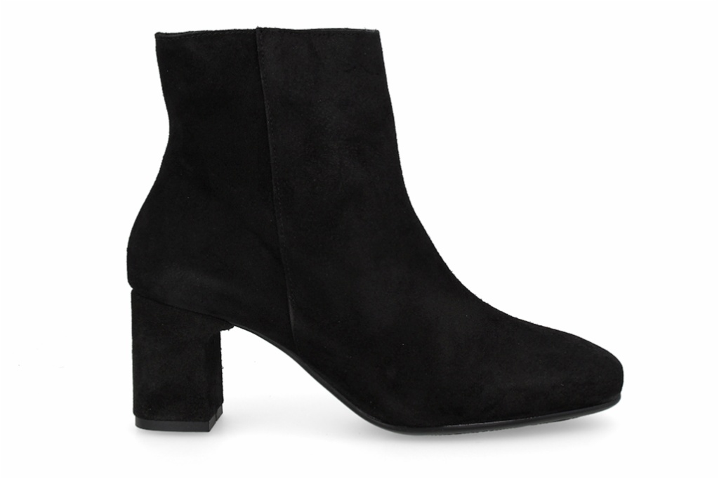 Elegantes botines en piel negra, con un diseño minimalista y una silueta de caña media. Su tacón bloque ancho y estable ofrece comodidad y un toque sofisticado para cualquier ocasión.