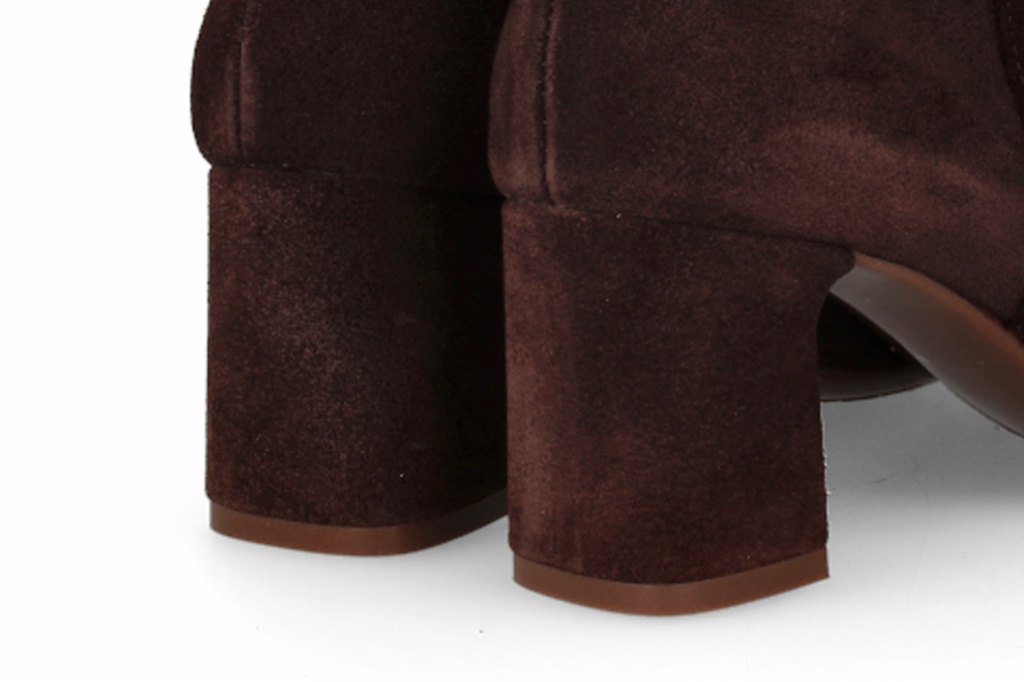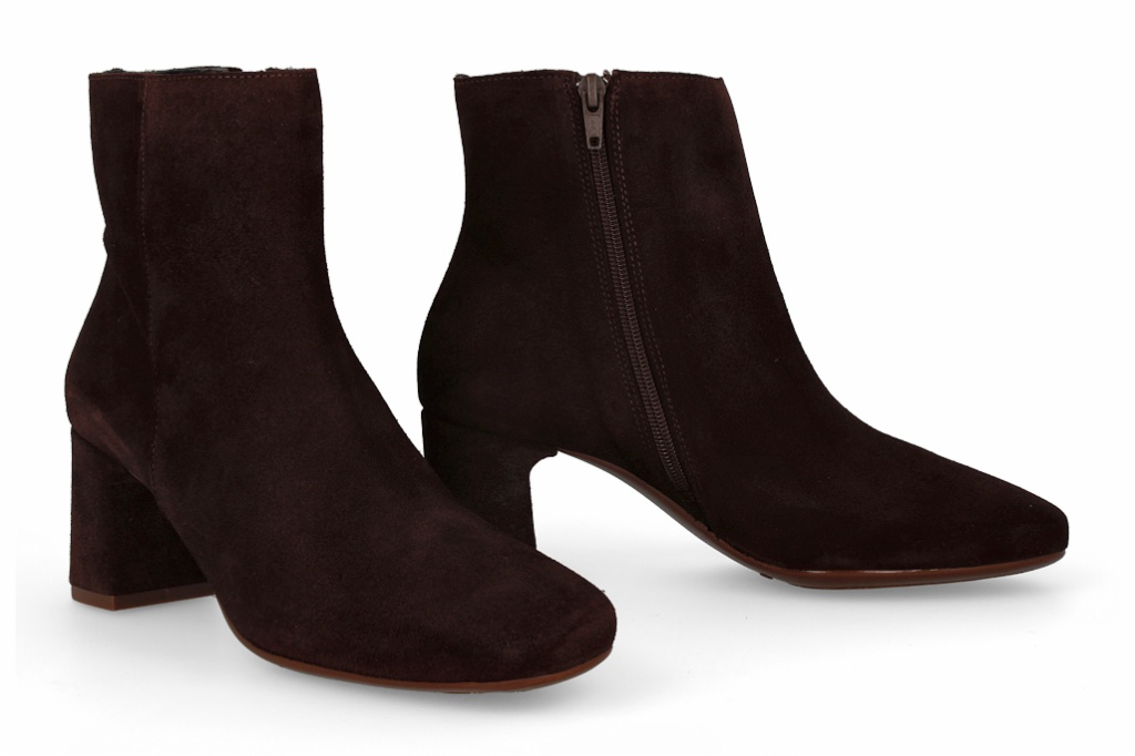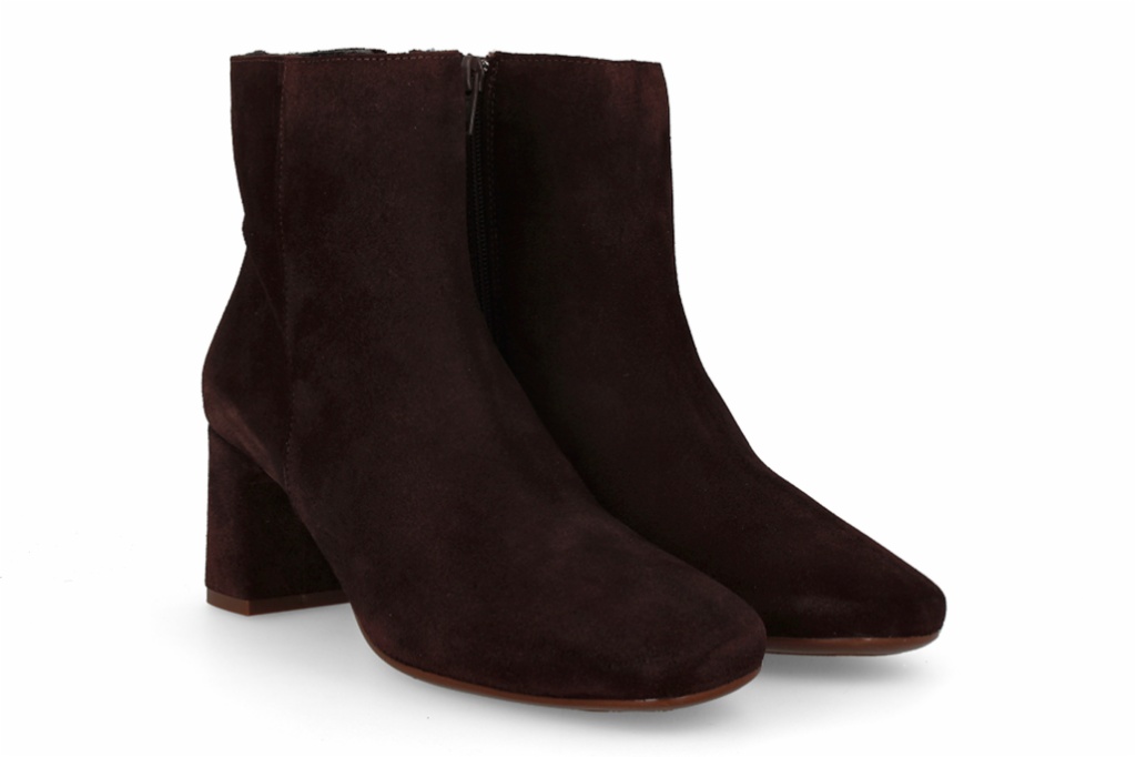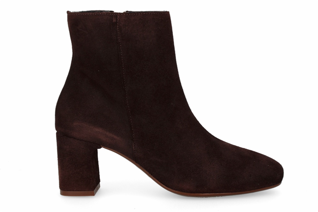 Elegantes botines en piel marrón oscuro, con un diseño minimalista y una silueta de caña media. Su tacón bloque ancho y estable ofrece comodidad y un toque sofisticado para cualquier ocasión.