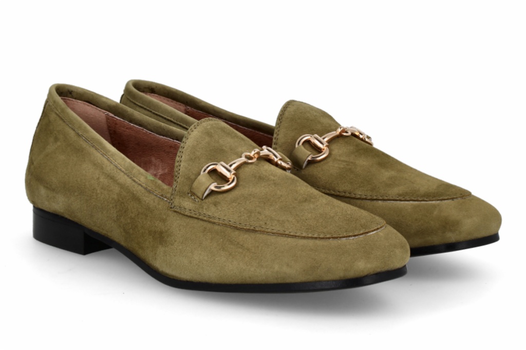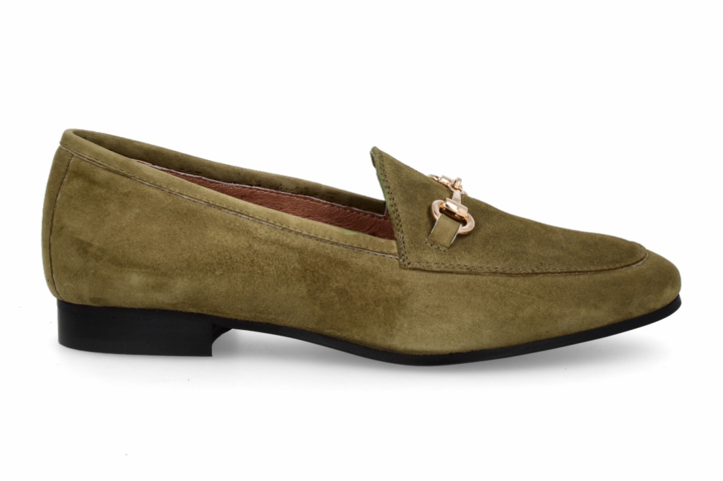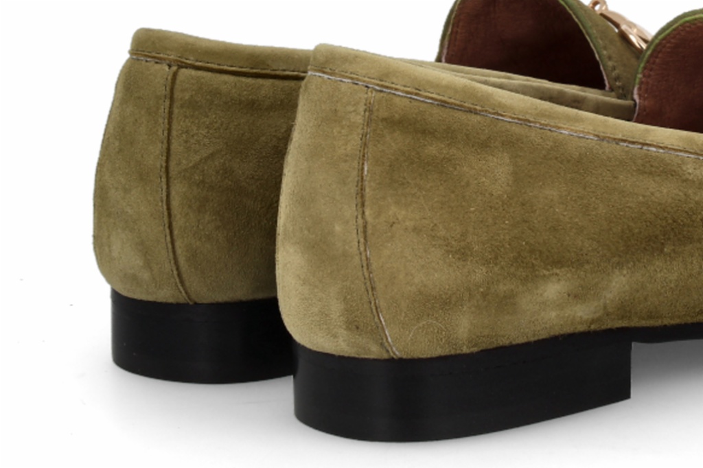 Mocasín de ante con detalle metálico frontal y acabado clásico.