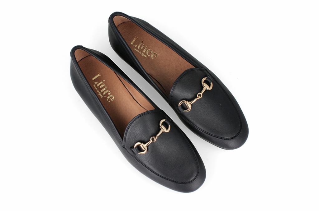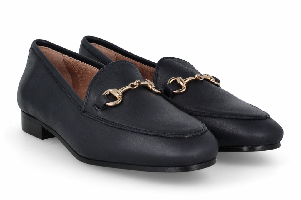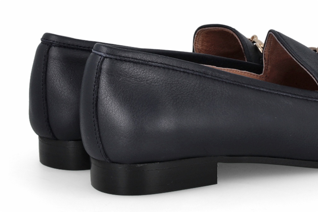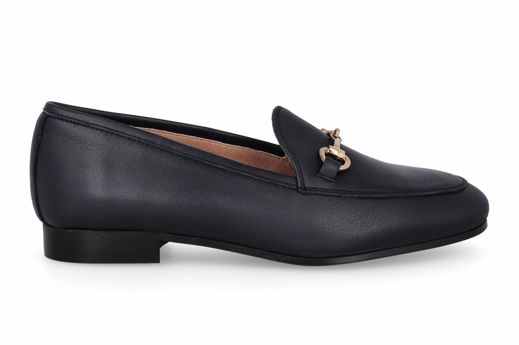 Mocasín de ante con detalle metálico frontal y acabado clásico.