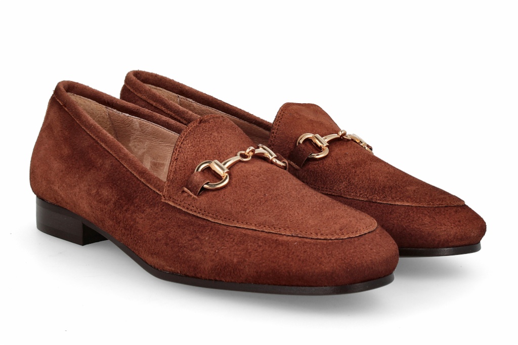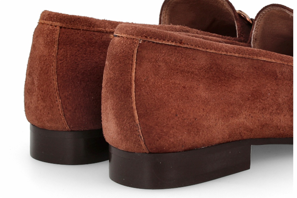 Mocasín de ante con detalle metálico frontal y acabado clásico.