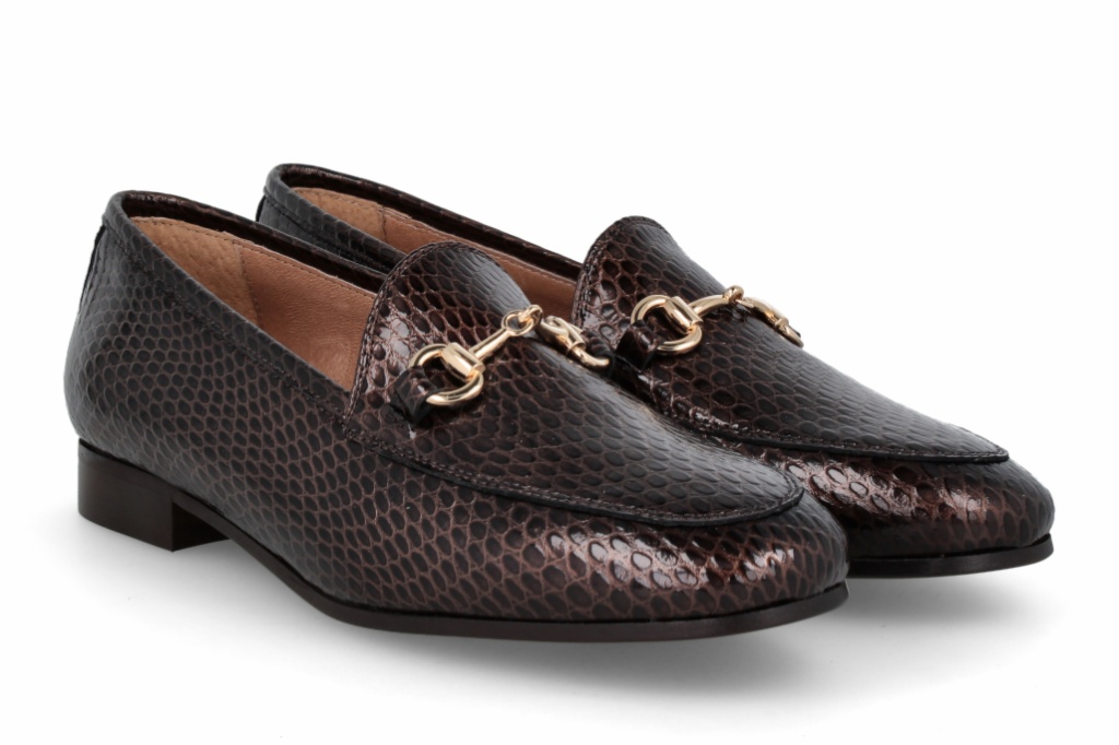 Mocasín de ante con detalle metálico frontal y acabado clásico.