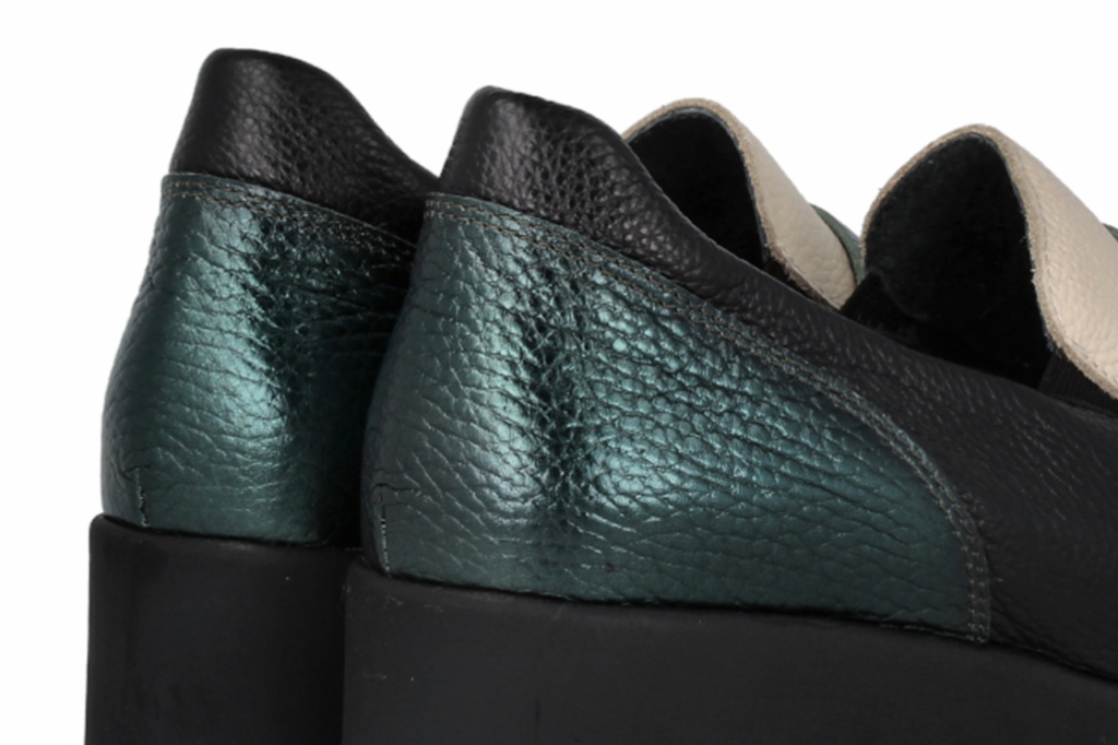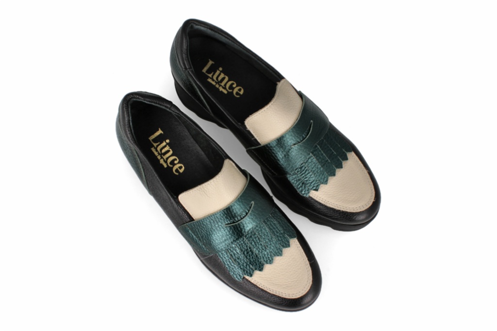 Mocasines de plataforma con un diseño audaz de estilo color block y textura. Combinan piel negra, un empeine en tono crema y un antifaz verde oscuro con flecos, ofreciendo un contraste llamativo. La suela de cuña gruesa y dentada asegura comodidad y un estilo atrevido, perfectos para un look vanguardista.