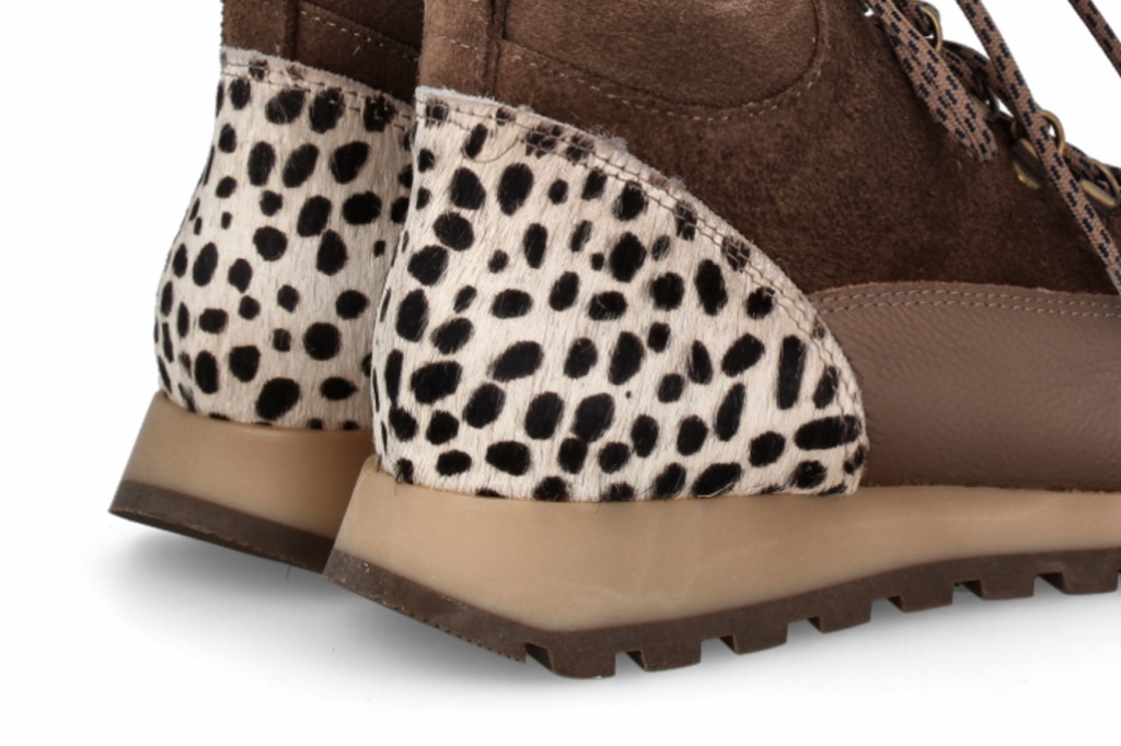 Combina estilo outdoor y moda con estos botines que mezclan ante y piel en tonos marrón cálido y herrajes de estilo trekking. El llamativo panel de animal print de leopardo en el talón añade un toque audaz y sofisticado al diseño. Su suela track bicolor garantiza una pisada ligera, cómoda y con excelente tracción para el día a día en la ciudad.
