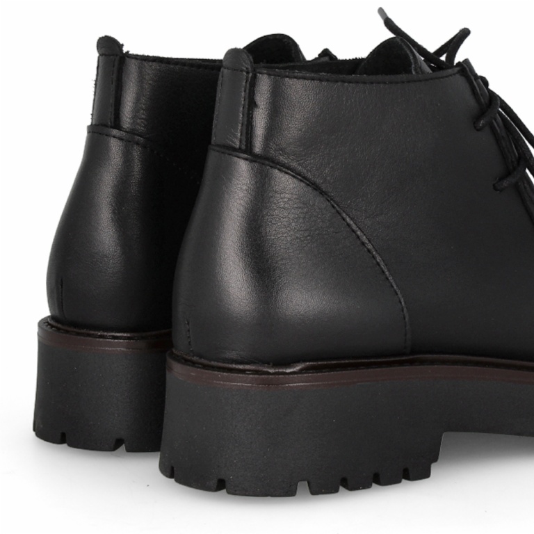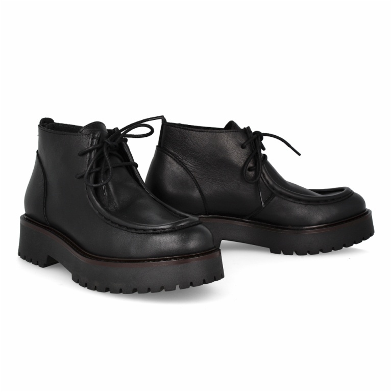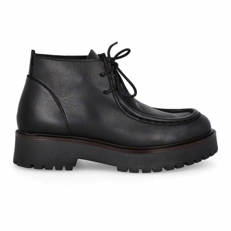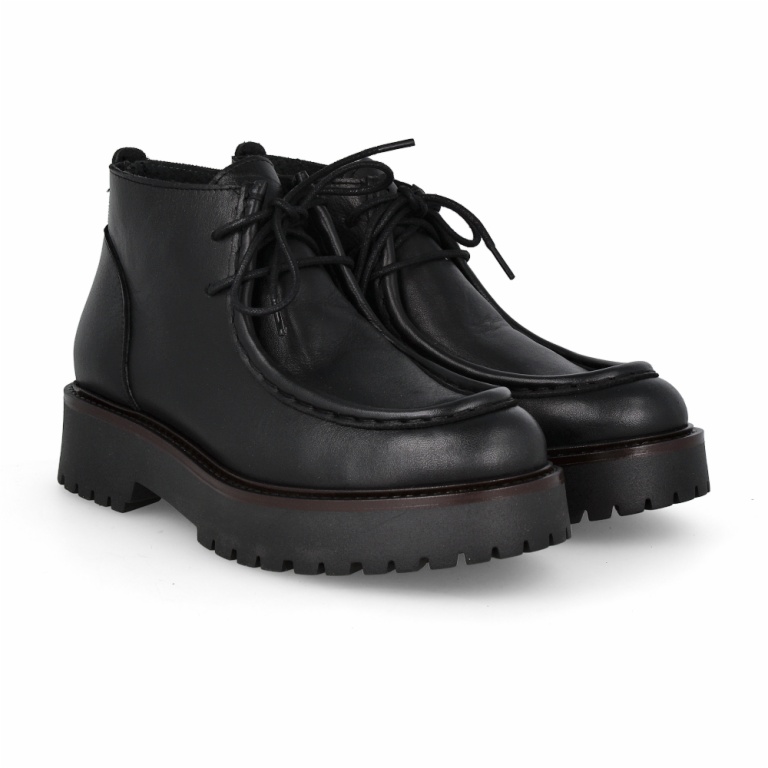 Descubre el estilo grunge elevado con estos botines de piel negra. Su suela track de plataforma robusta proporciona comodidad y altura, mientras que el diseño de puntera cosida y el cierre de cordones ofrecen un ajuste seguro y un toque fashion vanguardista, perfectos para destacar en tu día a día.