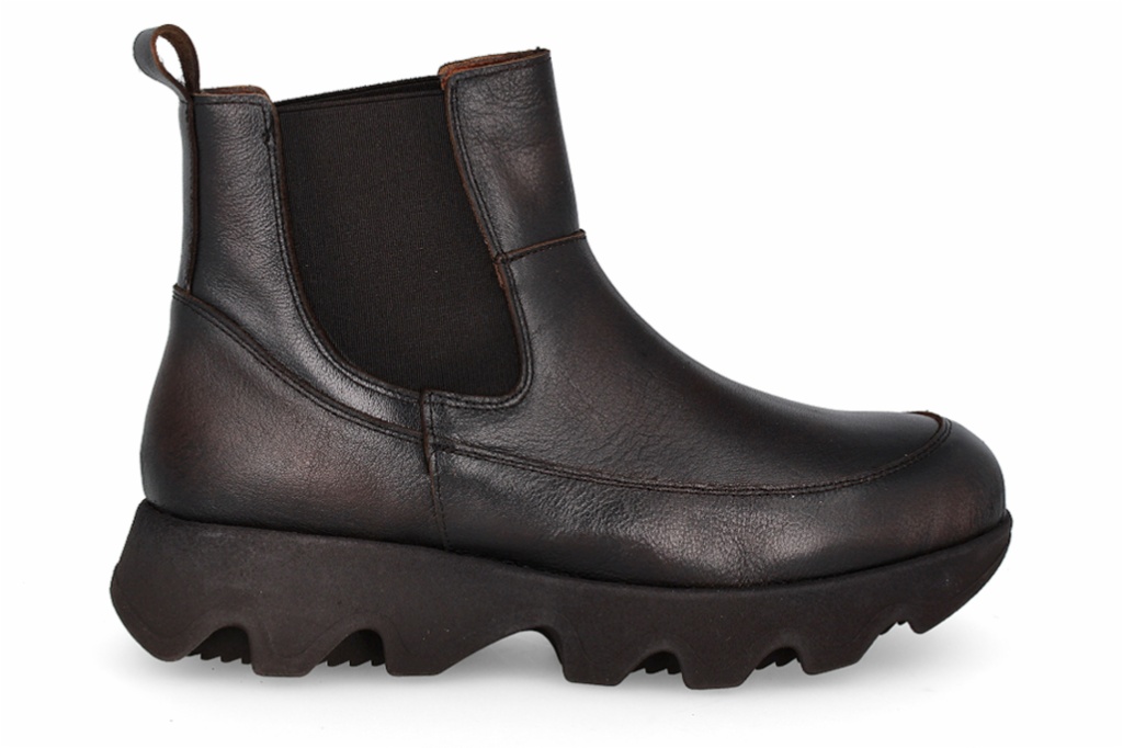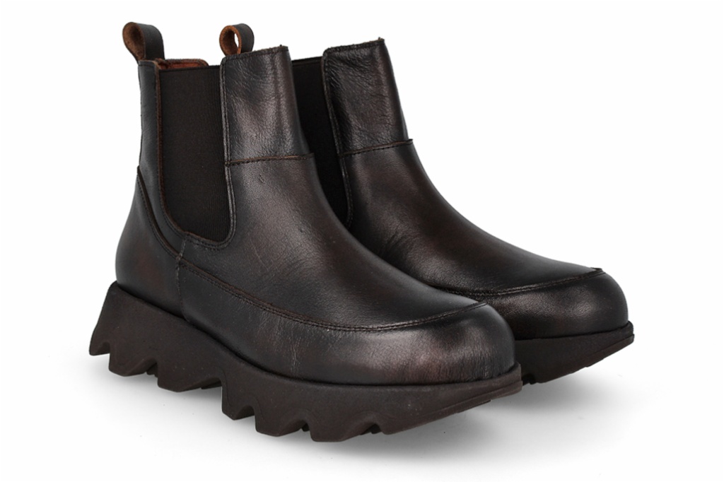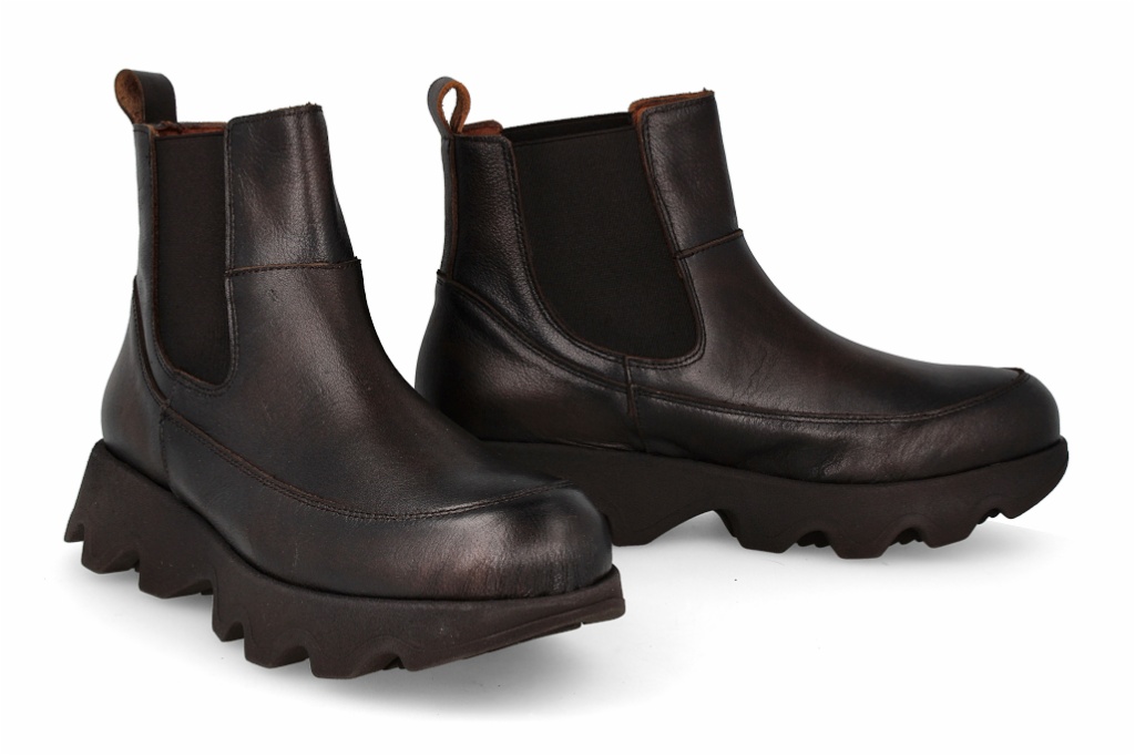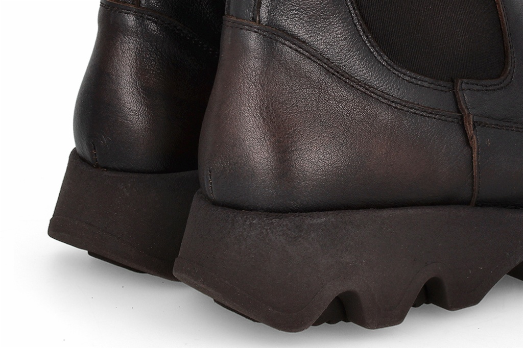 Estos atemporales botines Chelsea combinan la elegancia la piel marrón chocolate con una silueta moderna y robusta. Destacan por su suela track en color caramelo que ofrece una excelente tracción y un estilo de tendencia. El elástico lateral a contraste asegura un ajuste perfecto y fácil de calzar, ideal para el día a día.