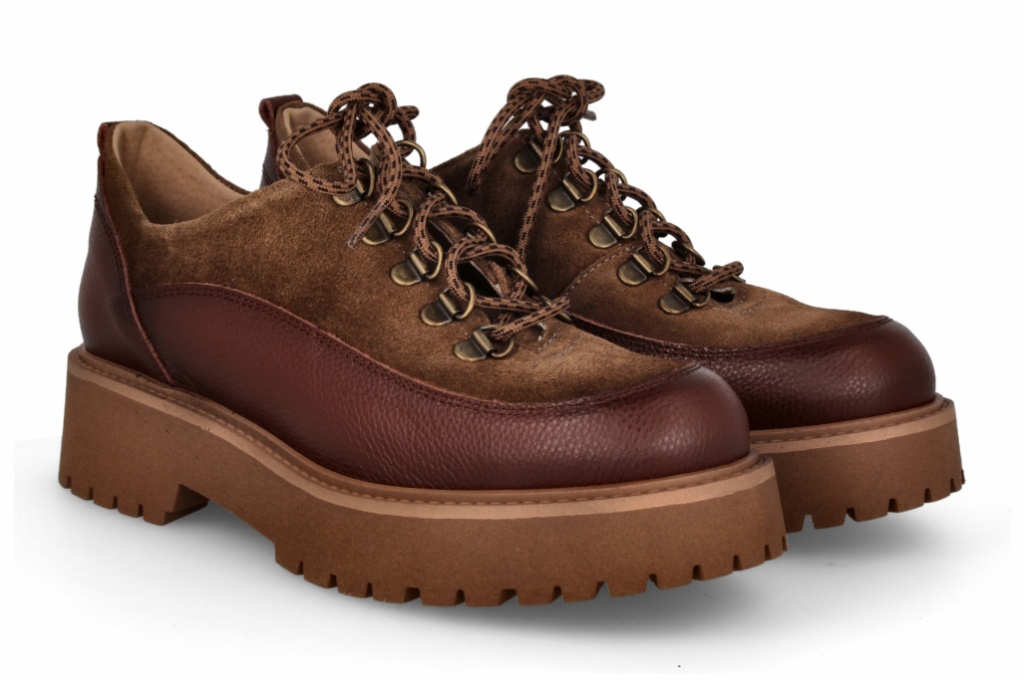 Redefine tu comodidad con estos bluchers en piel roble, combinando un estilo clásico con un diseño moderno. La suela de plataforma ondulada y alta proporciona una pisada estable y amortiguada sin renunciar a la altura. El toque final lo dan los cordones bicolores en azul y negro, añadiendo un detalle deportivo y vibrante.