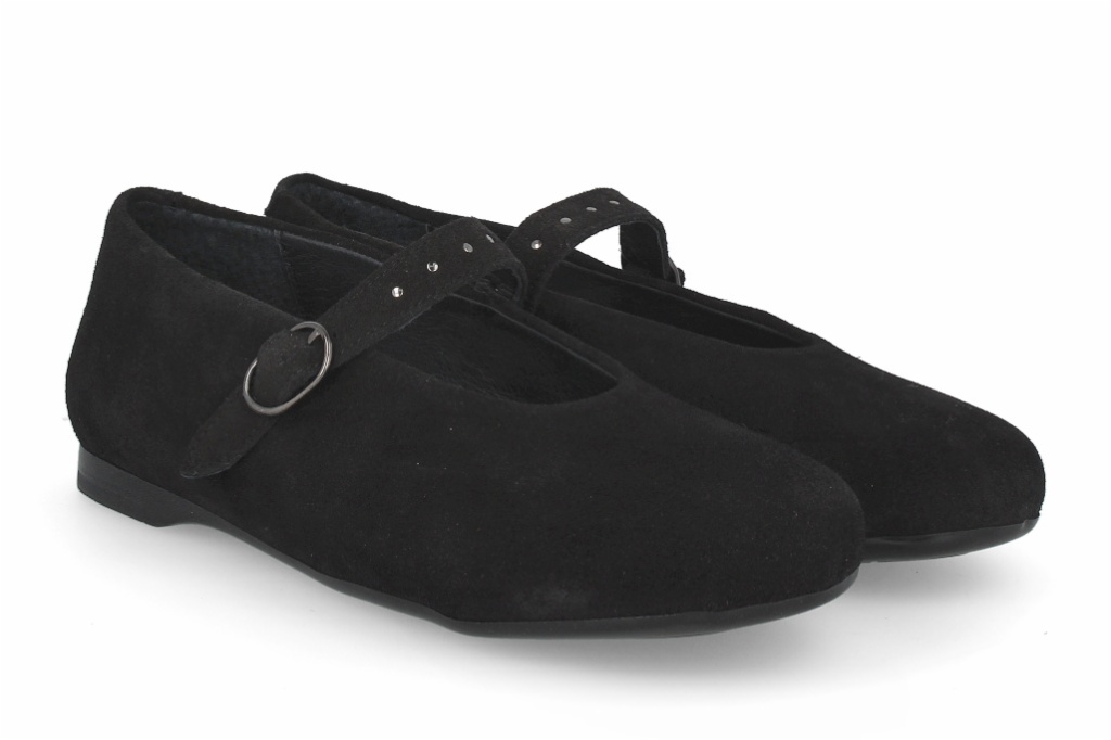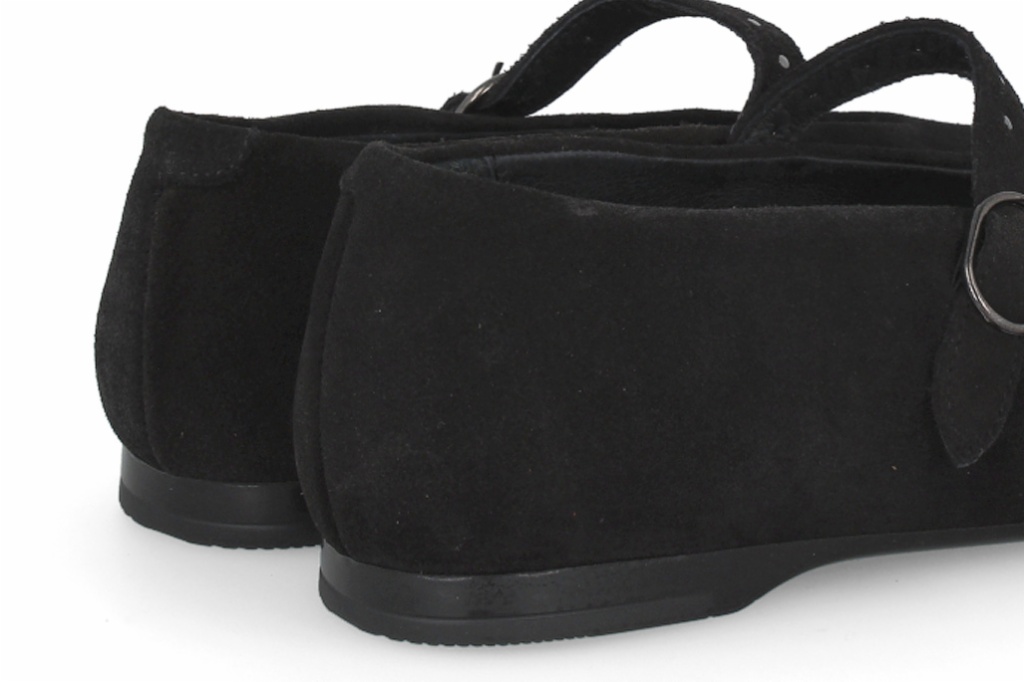Bailarinas clásicas de piel, ofreciendo un estilo atemporal y comodidad para cualquier ocasión. Diseño Mary Jane con pulsera sobre el empeine adornada con discretos remaches metálicos. Cierre de hebilla ajustable lateral que asegura un ajuste perfecto y un toque elegante.