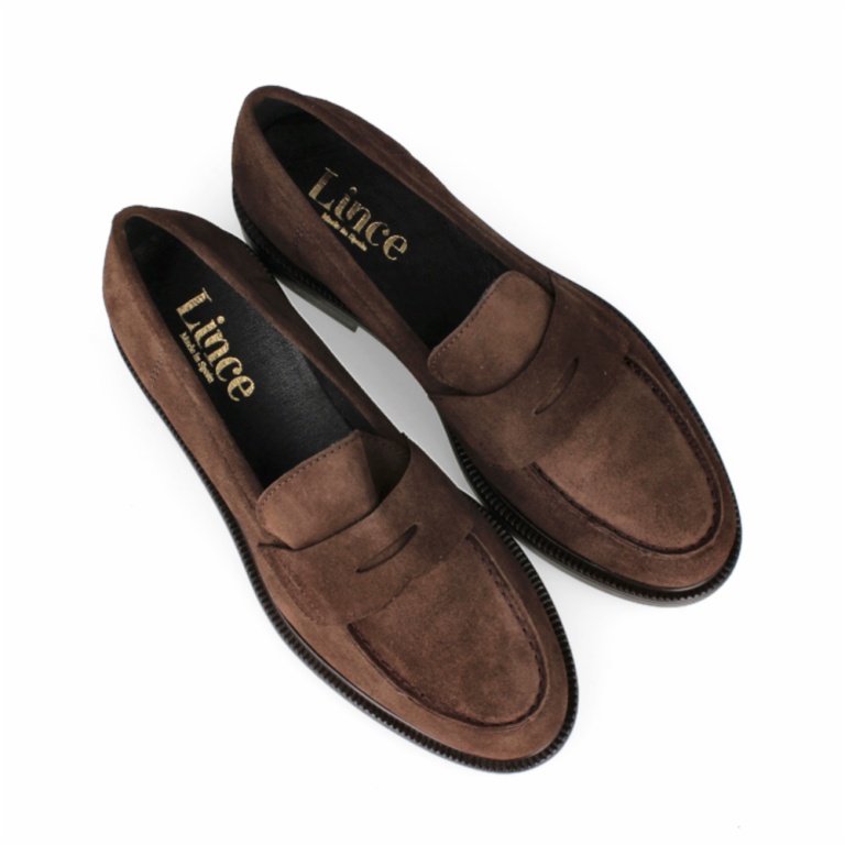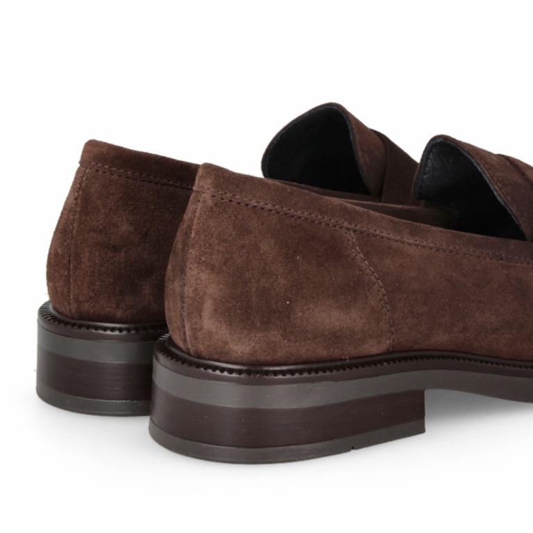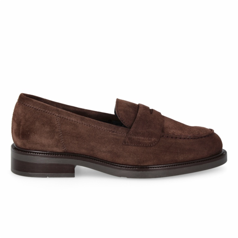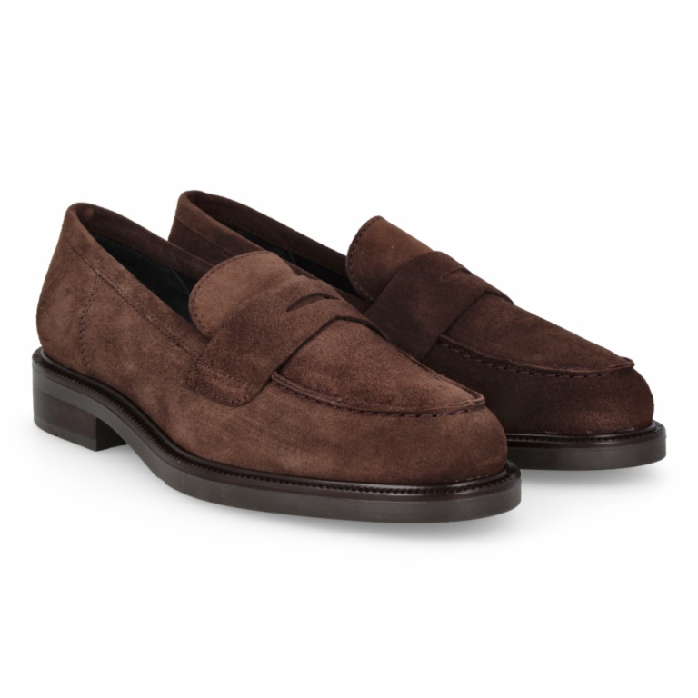 Disfruta del lujo y el confort con estos mocasines, confeccionados en suave serraje color tabaco. El clásico adorno metálico dorado en el empeine aporta un toque de sofisticación atemporal y distinguida. Su suela robusta y plana garantiza un estilo elegante y una comodidad duradera para cualquier ocasión.