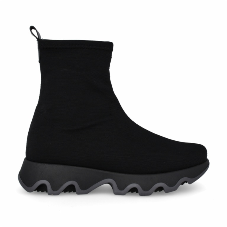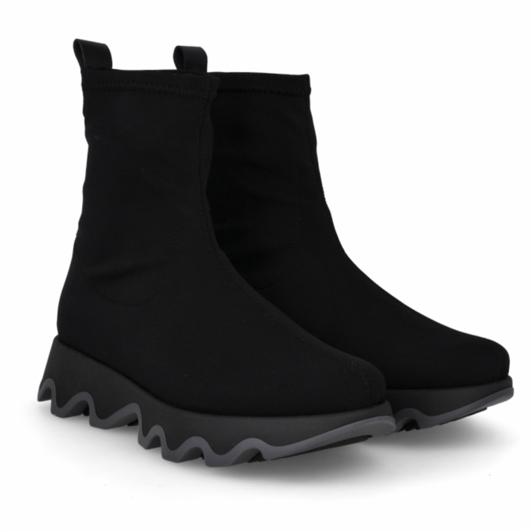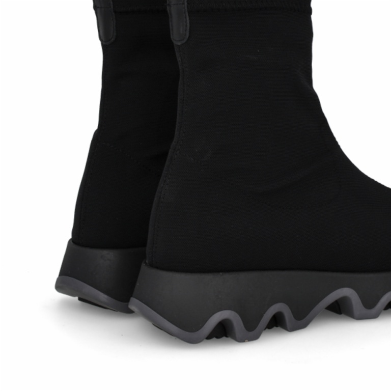 Estos botines en licra negra ofrecen una versión robusta y moderna de un clásico esencial, ideal para quienes buscan un estilo urbano con carácter.