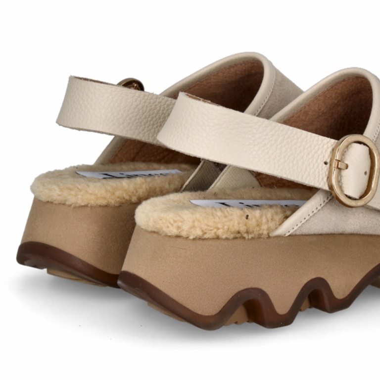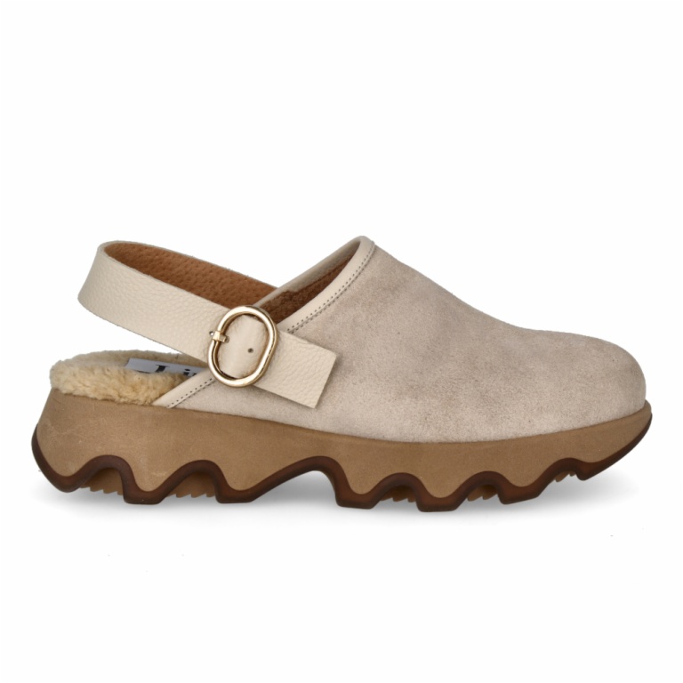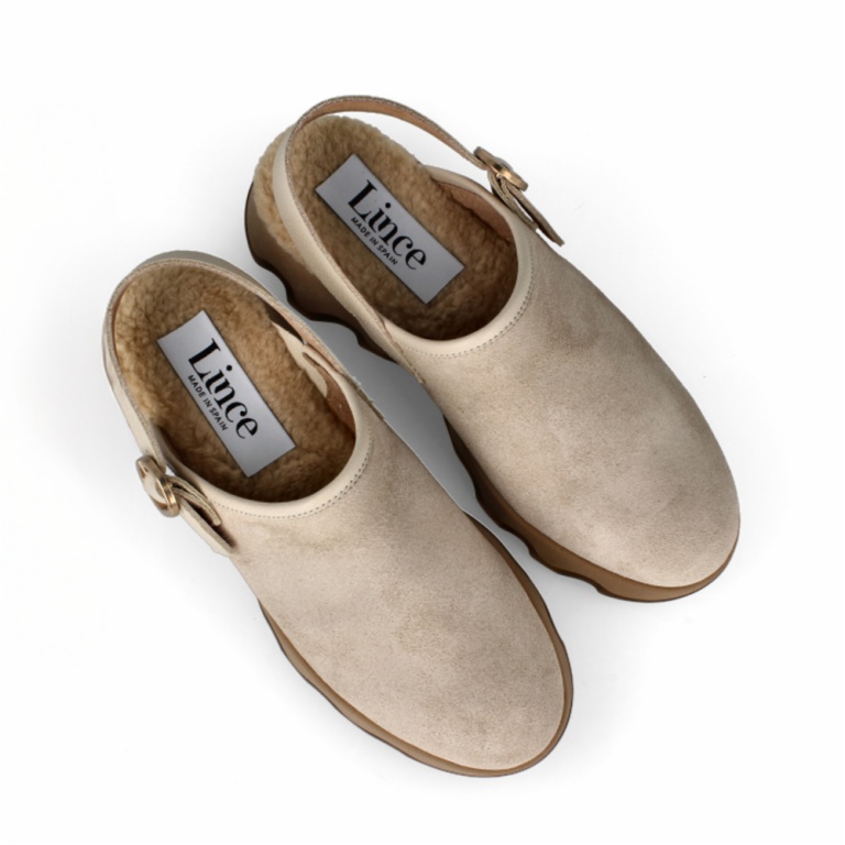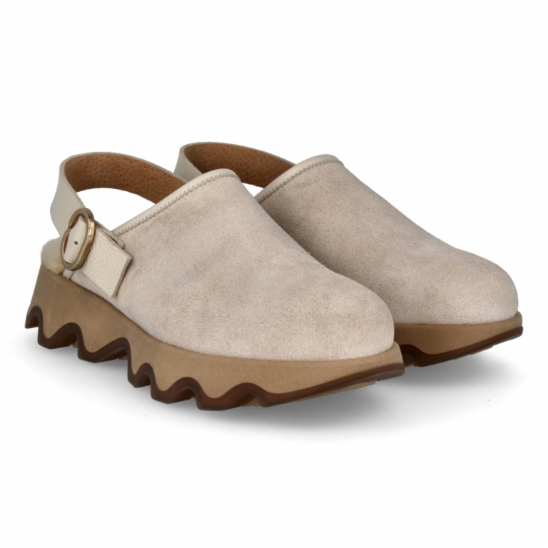 Zueco de serraje con diseño cerrado y suela ondulada de plataforma que aporta originalidad y confort. Tira trasera con hebilla ajustable para un ajuste seguro y fácil de llevar.