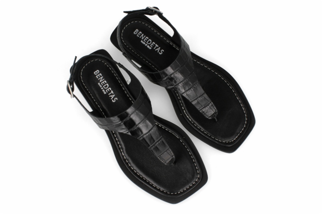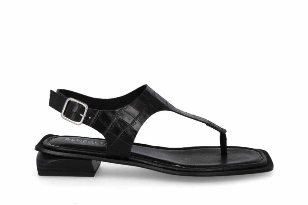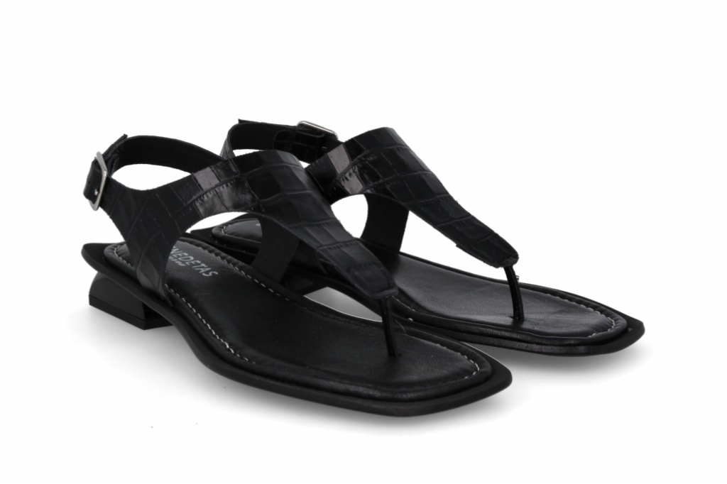 Sofisticadas sandalias de piel negras con grabado efecto cocodrilo y diseño de dedo tipo "thong". Presentan una moderna suela cuadrada, tacón bajo geométrico y cierre de hebilla ajustable al tobillo para un ajuste perfecto. Un modelo elegante y versátil, ideal para añadir un toque de distinción a tus estilismos veraniegos.