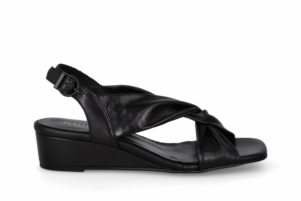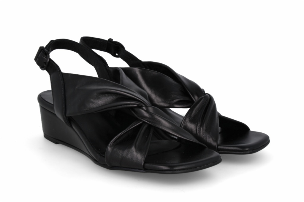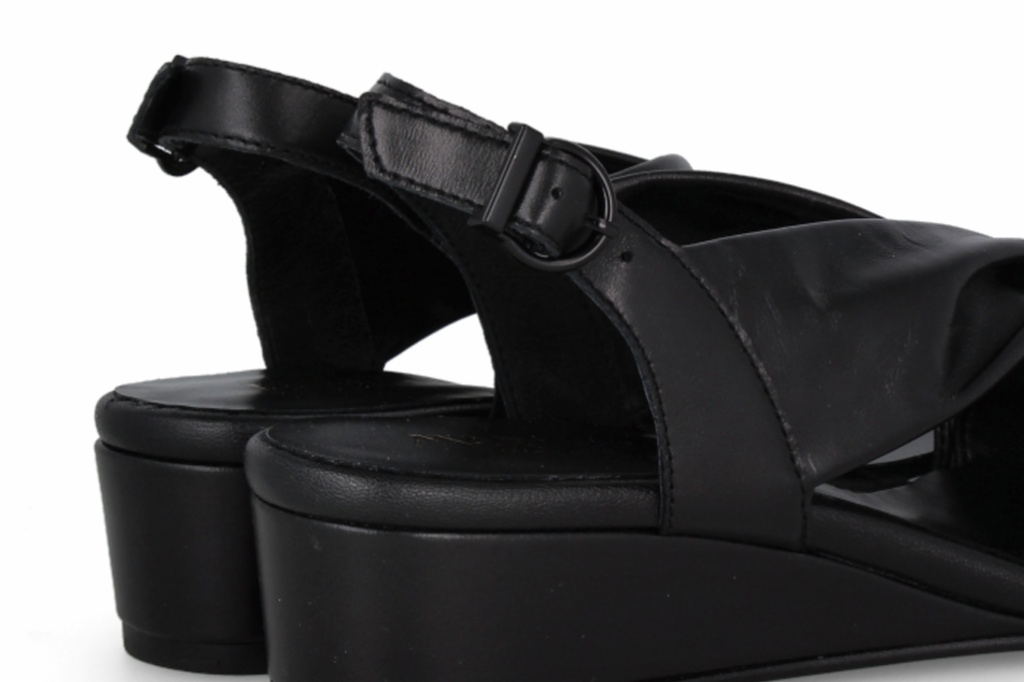 Elegantes sandalias de piel en color negro con un sofisticado diseño de tiras anudadas que aporta un toque distintivo. Cuentan con un cómodo tacón tipo cuña y cierre ajustable, ideales para elevar cualquier look con estilo y confort. Un básico atemporal de alta calidad que combina a la perfección versatilidad y tendencia para tu día a día.